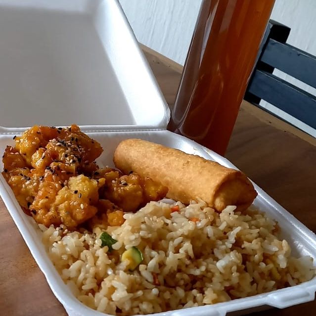 Arroz frito acompañado de pollo a la naranja y 1pz de rollito primavera de camaron y una bebida gratis