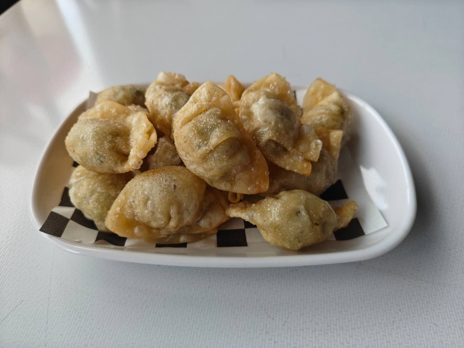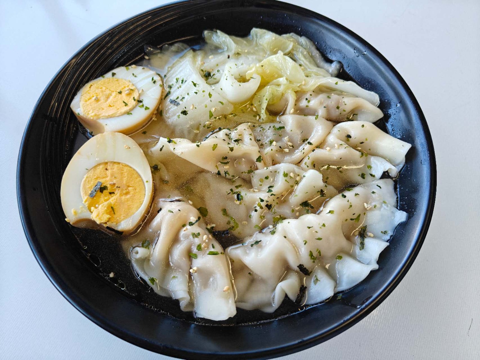 Lleva gyoza de pollo, huevo, verduras y cardo.