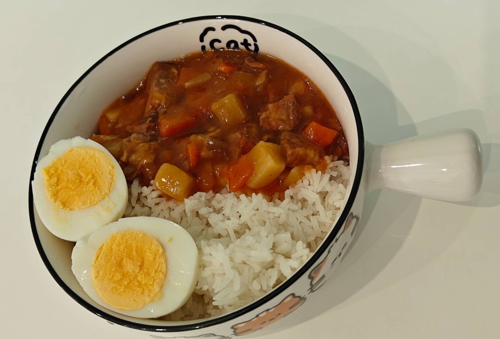 Lleva arroz blanco, huevo, res, zanahoria, papas con poquitito de picante.