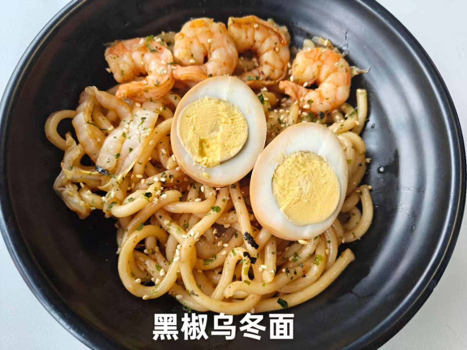Lleva ramen de udon, huevo, verduras, chashiu o camarón, ajonjolí, alga con la salsa de pimiento negro.
