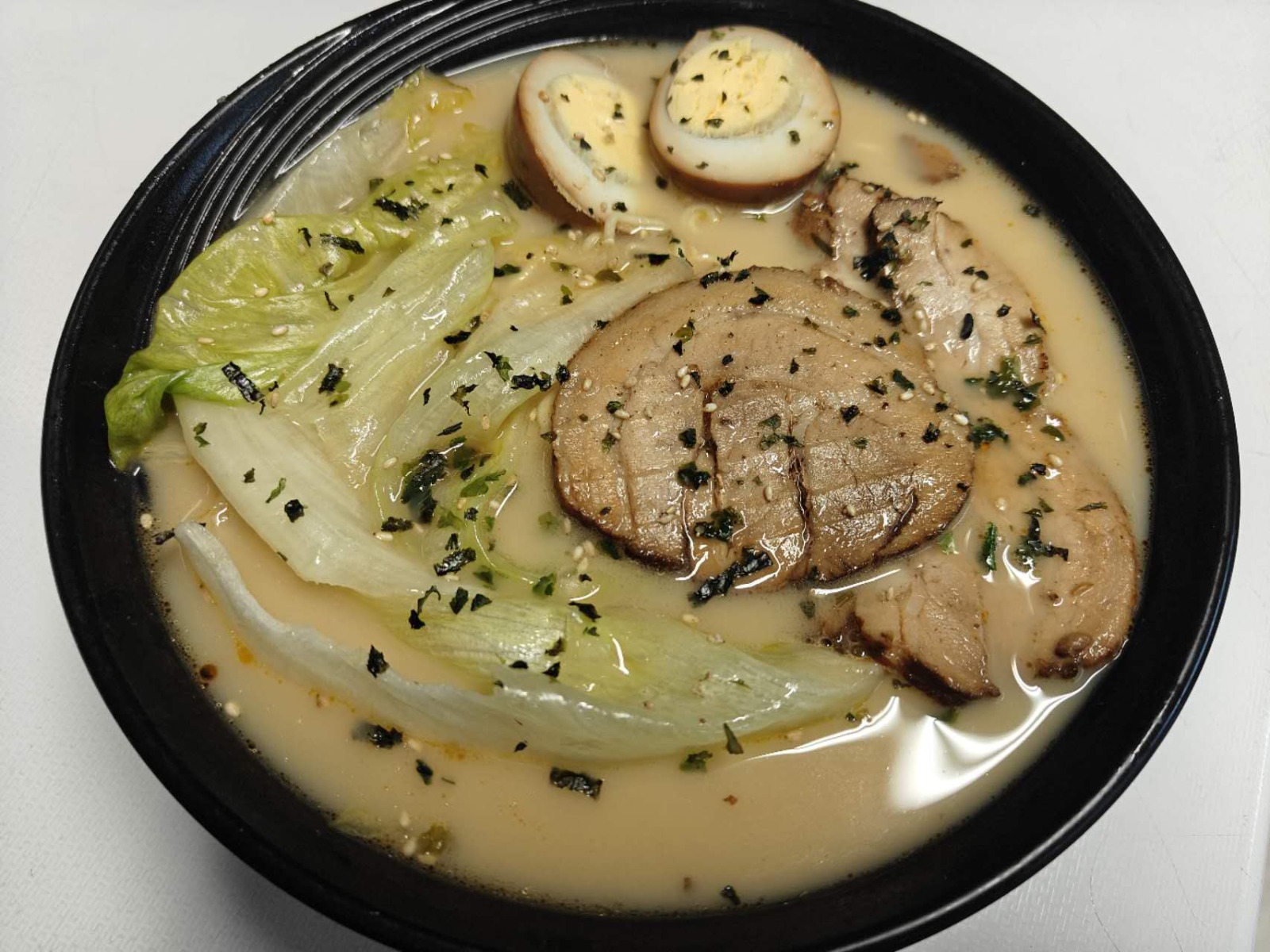 Un ramen con sopa de tonkutsu (cerdo), lleva huevo, verdura, cerdo, alga y ajonjolí.