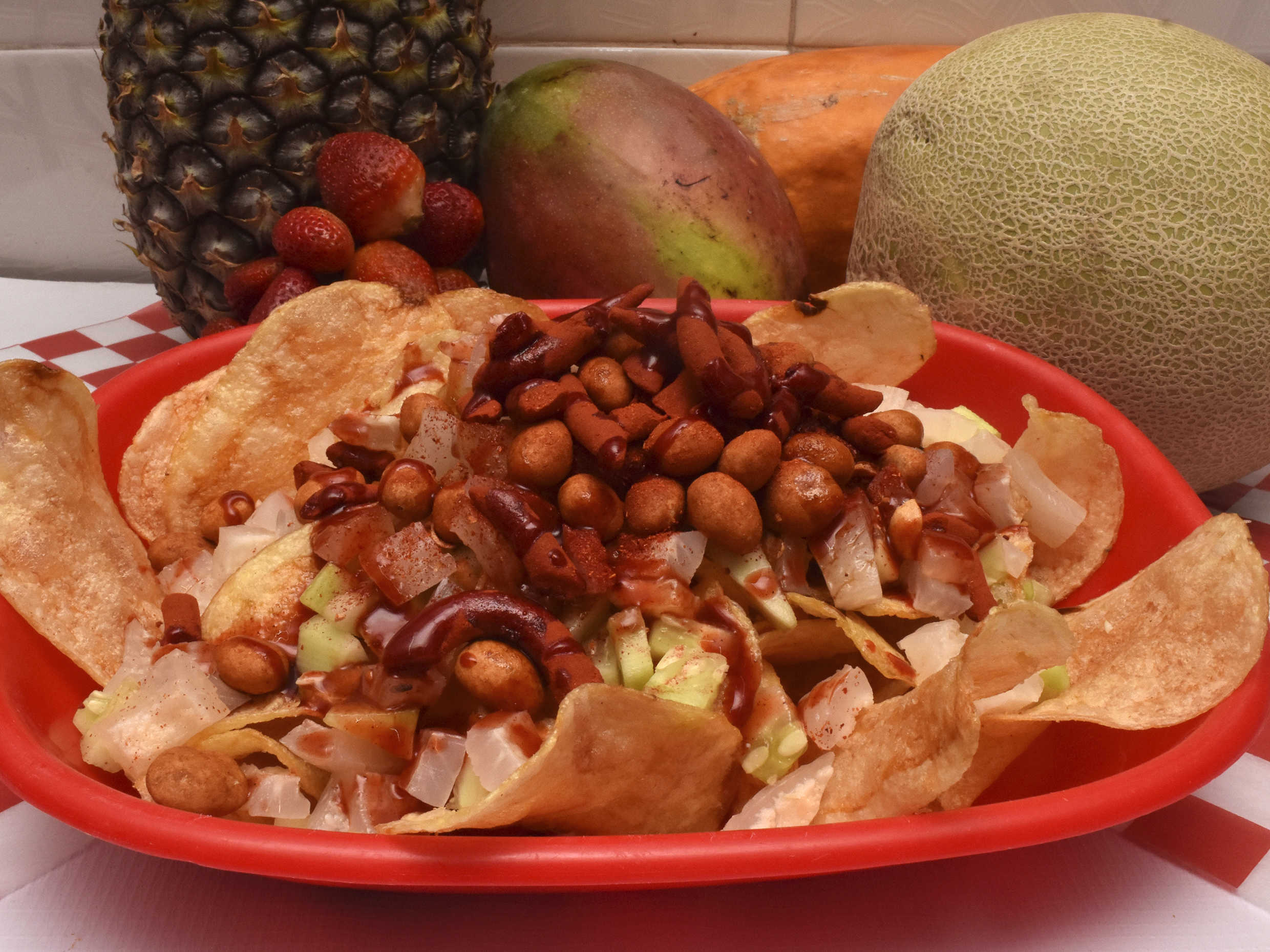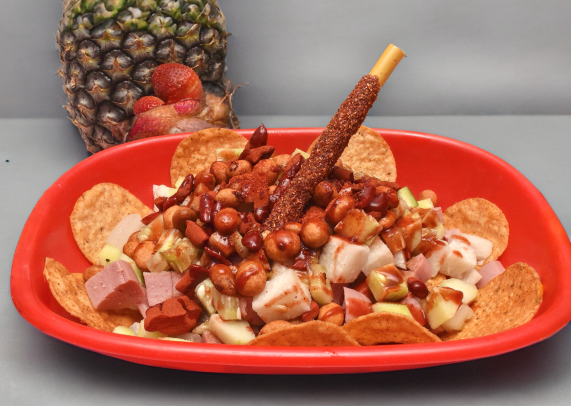 110Gr de papa dorada, cueritos, cacahuate japones, rielitos y pepino (salsa Maggi, inglesa, chile valentina, clamato, chamoy, chile en polvo, limón y sal).