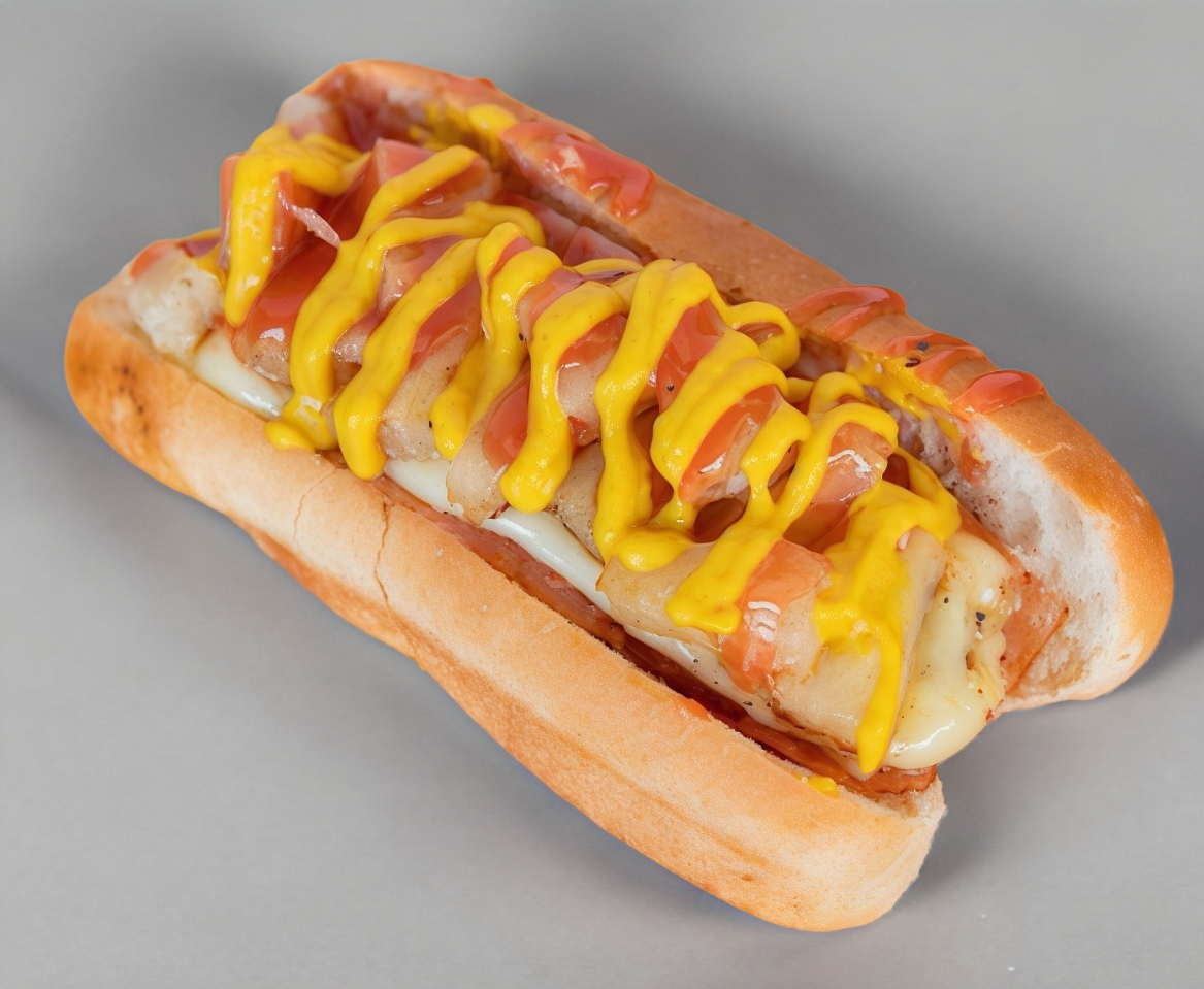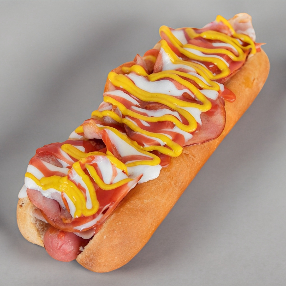 Salchicha, queso gouda, salsa bbq, jitomate, cebolla, crema, cátsup, mostaza.