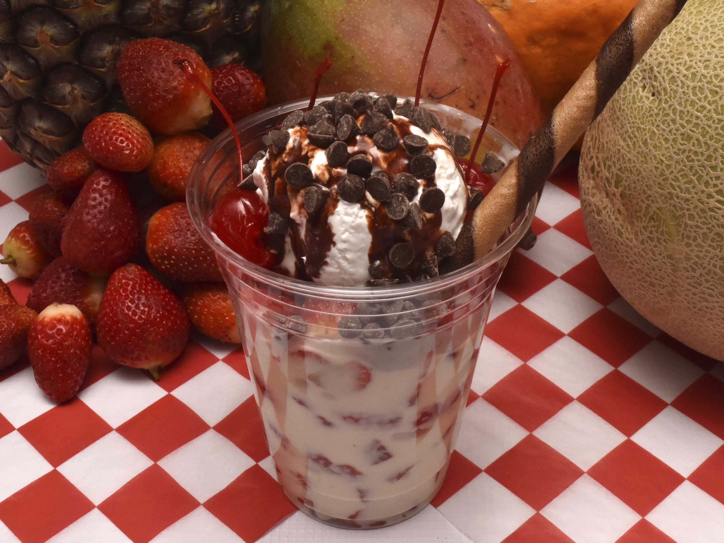 2 Frutas a elegir: , fresa, plátano. 3 Ingredientes a elegir: lechera, cajeta, nutella, chocolate, mermelada de zarzamora, miel maple, chispas de chocolate, chispas de colores, coco dorado, nuez.