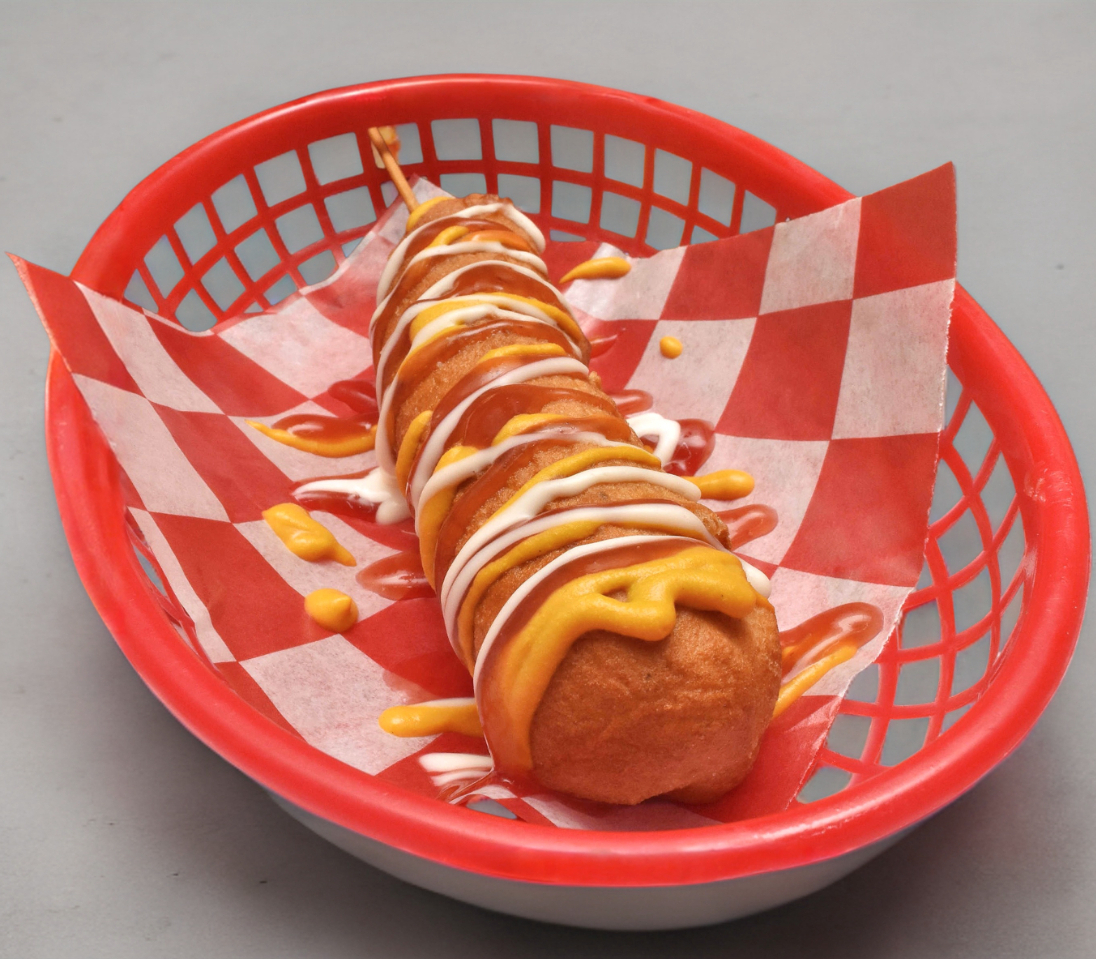 salchicha de pavo o queso o combinada forrada de masa tipo coreana y de cuadritos de papa