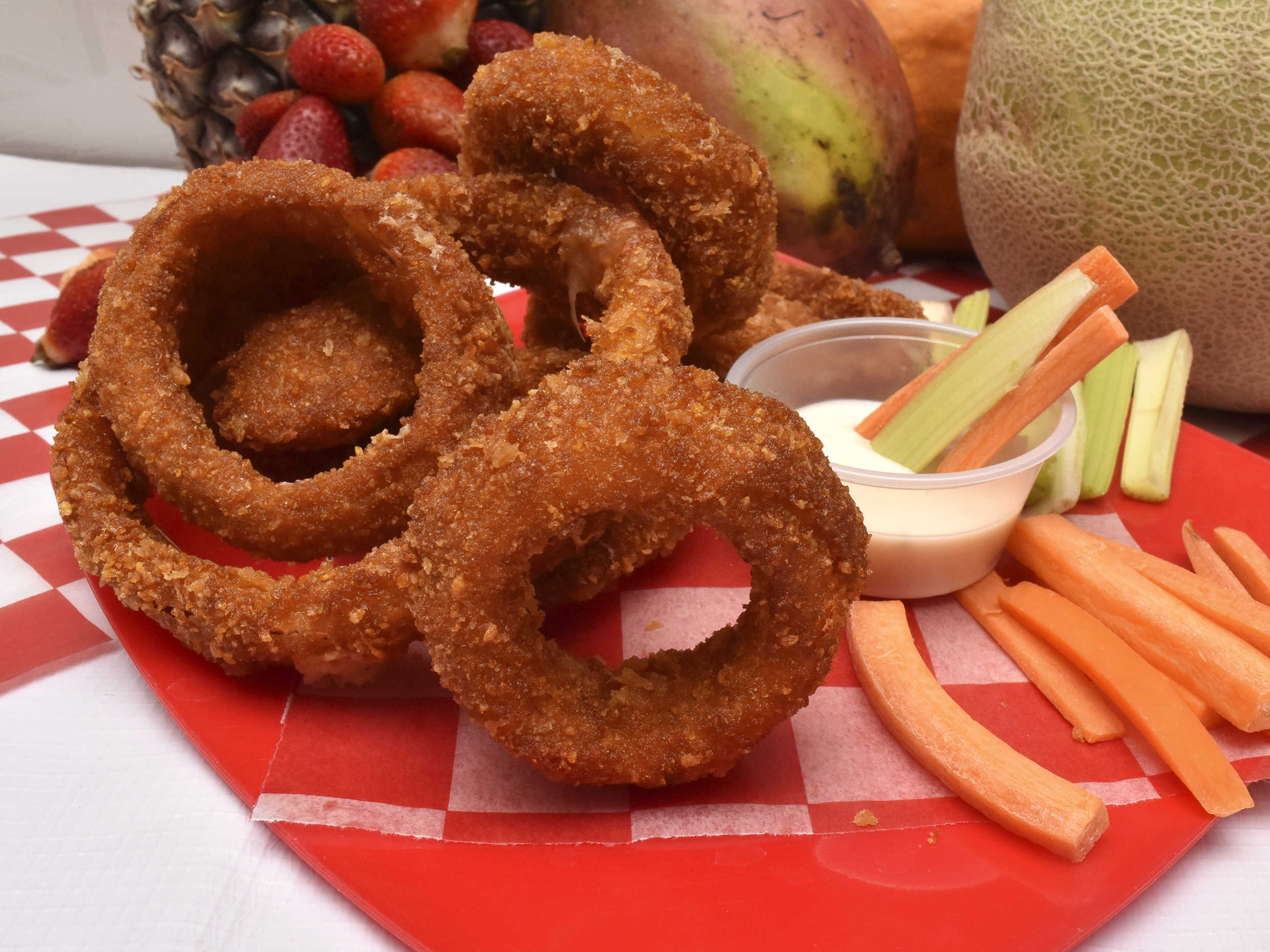 10 Aros de cebolla acompañados con apio, zanahoria y un dip de aderezo ranch.