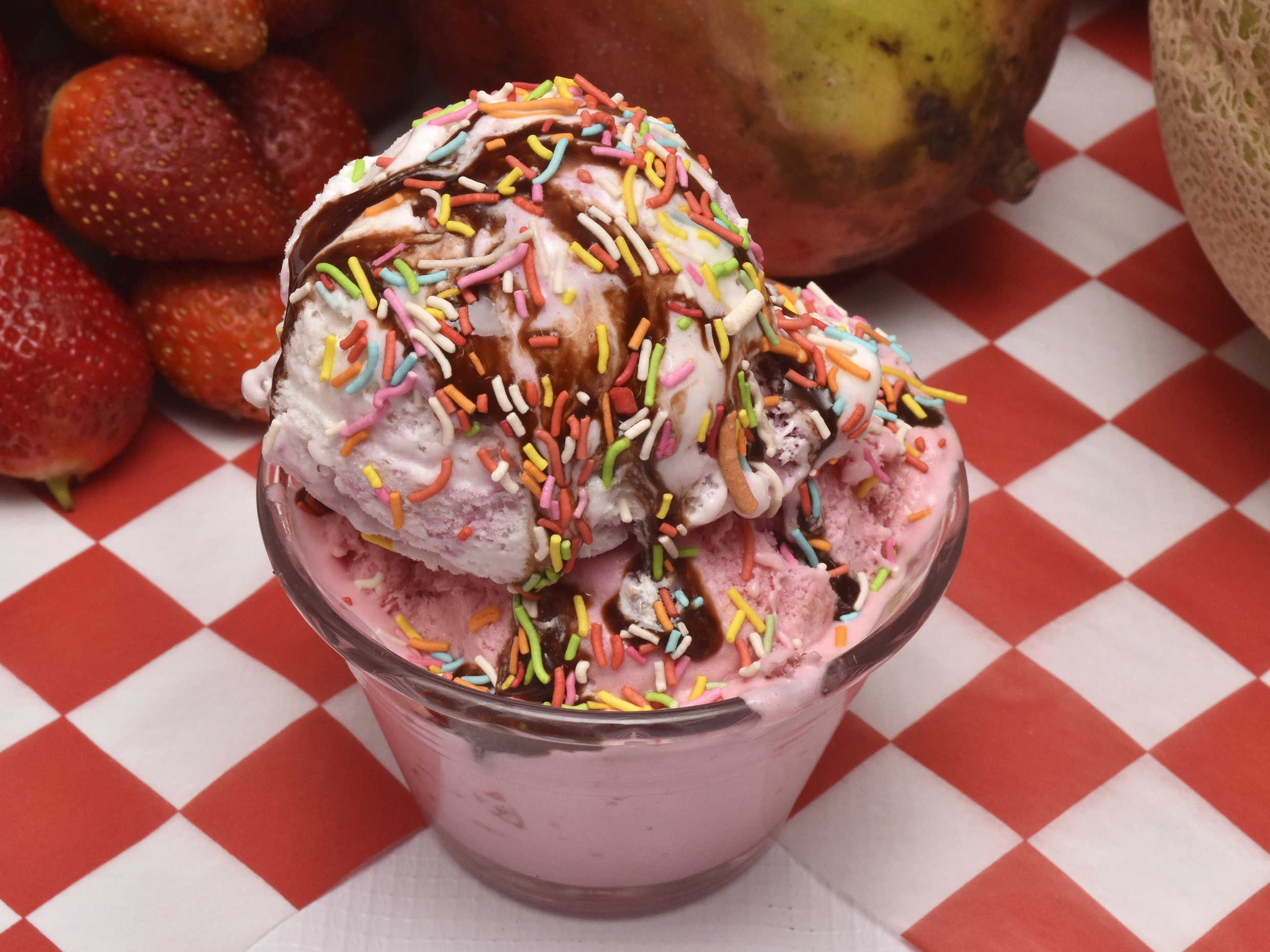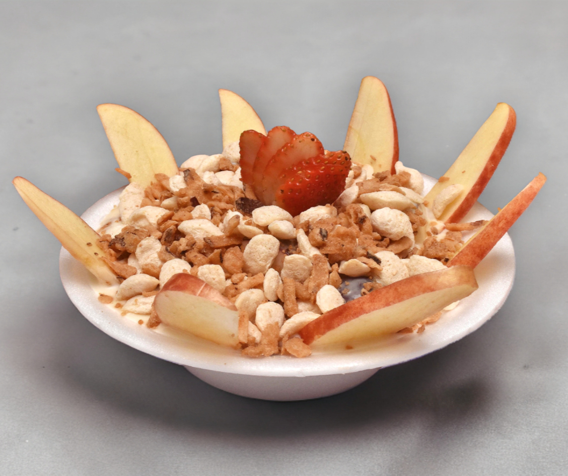 1 Sabor de nieve a elegir: chocochip, fresa, yogurt natural, yogurt durazno 3 frutas a elegir: zarzamora, frambuesa, fresa, plátano, 3 cereales a elegir: lechera, cajeta, nutella, mermelada zarzamora, miel maple, chispas de colores, chispas de chocolate, coco dorado, nuez.
