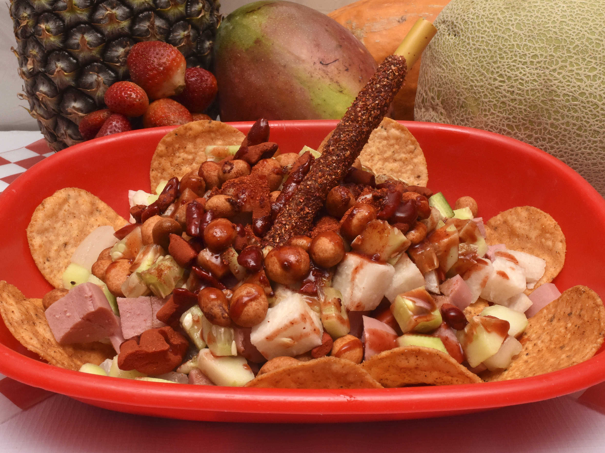 Pepino, jícama, salchicha, cueritos, cacahuate japonés, rielitos (salsa Maggi, inglesa, chile en polvo, chile valentina, clamato, chamoy, limón y sal.