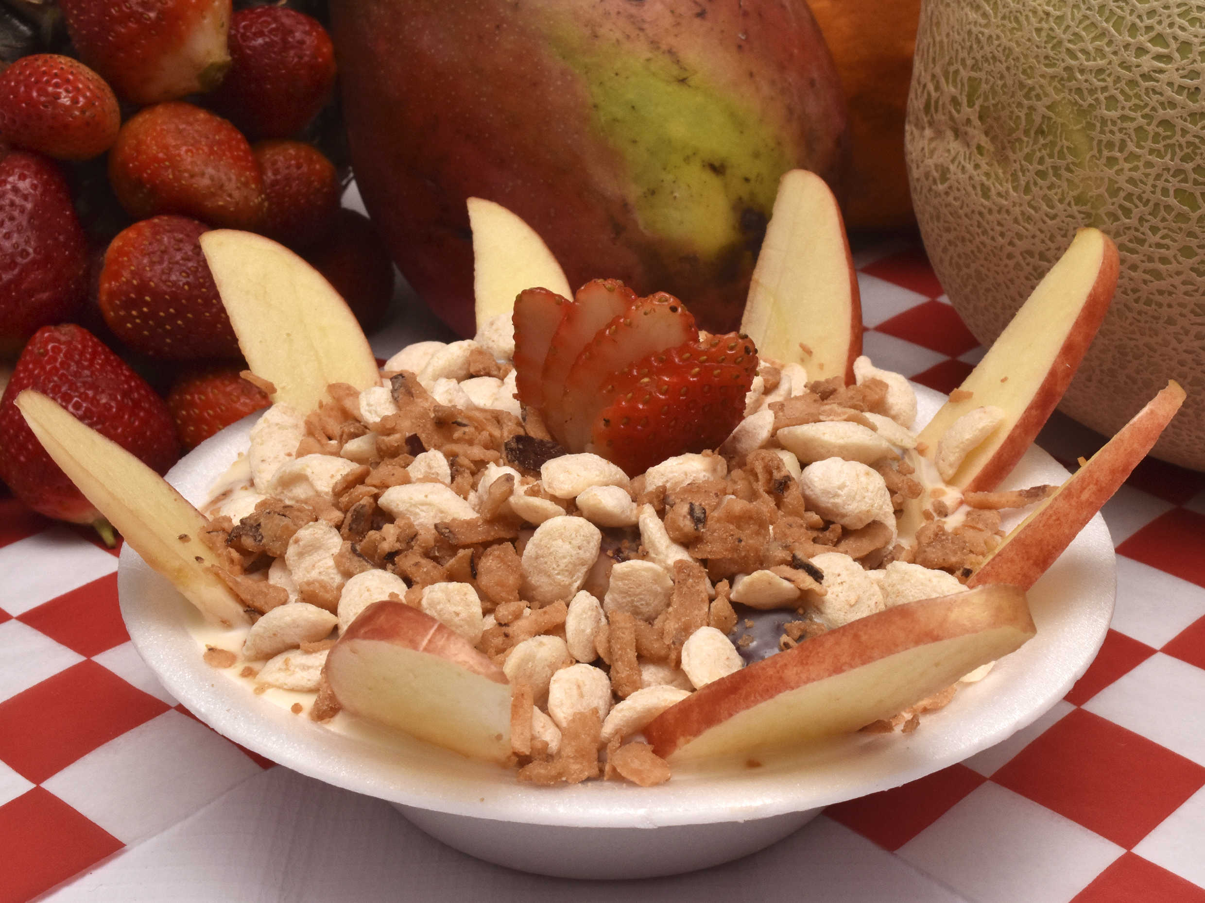 Plátano, manzana, uva, guayaba, melón, papaya, fresa, mango (crema, yogurt natural, yogurt fresa) cereales: chispas de colores, trigo, arroz inflado. Granola, almendra, cacahuate, amaranto, pasas, coco dorado, coco blanco, chispas de chocolate, nuez, lunetas (4 a elegir).