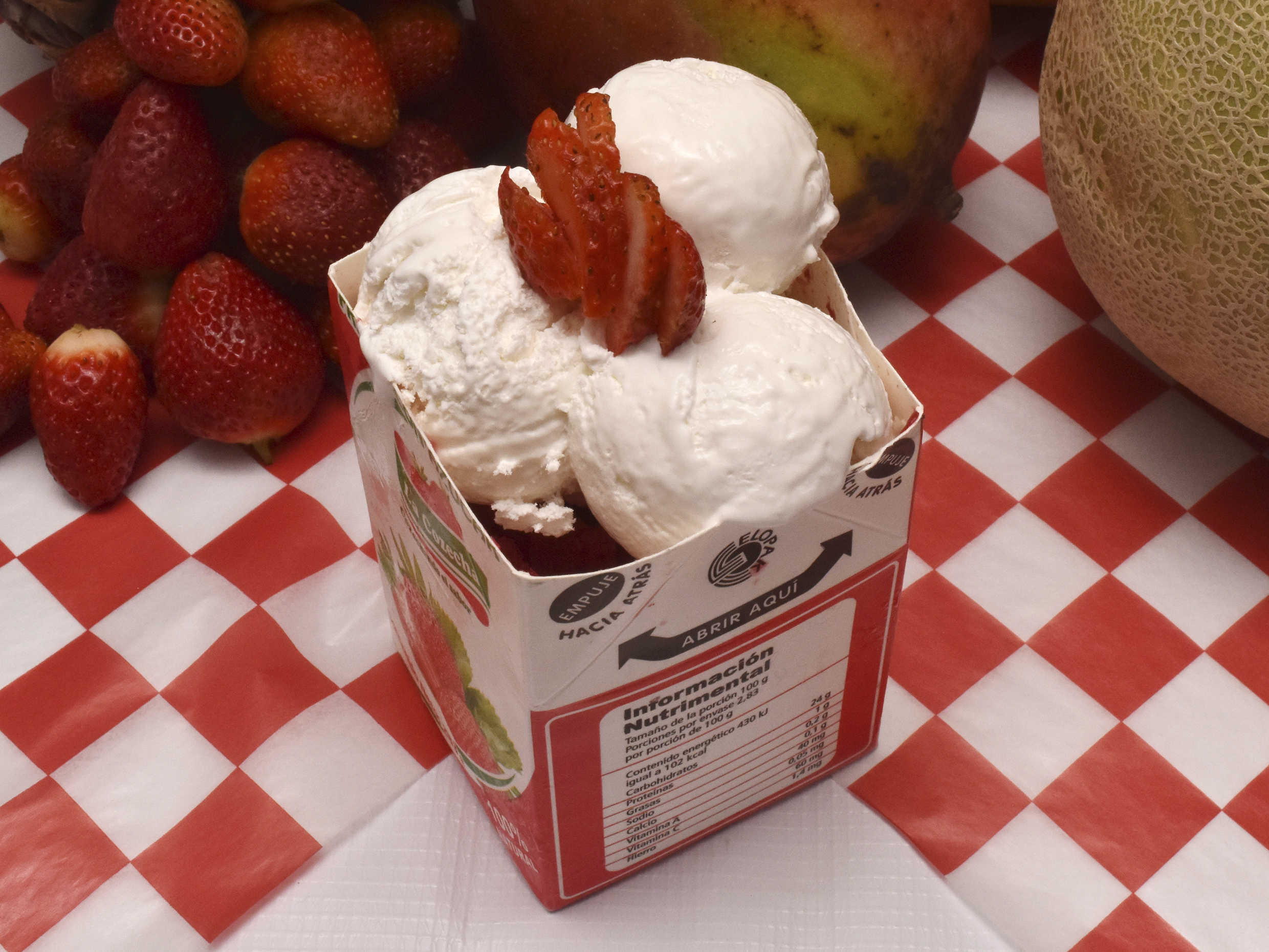 Cajita de fresas congeladas con crema chantilly y chocolate derretido.