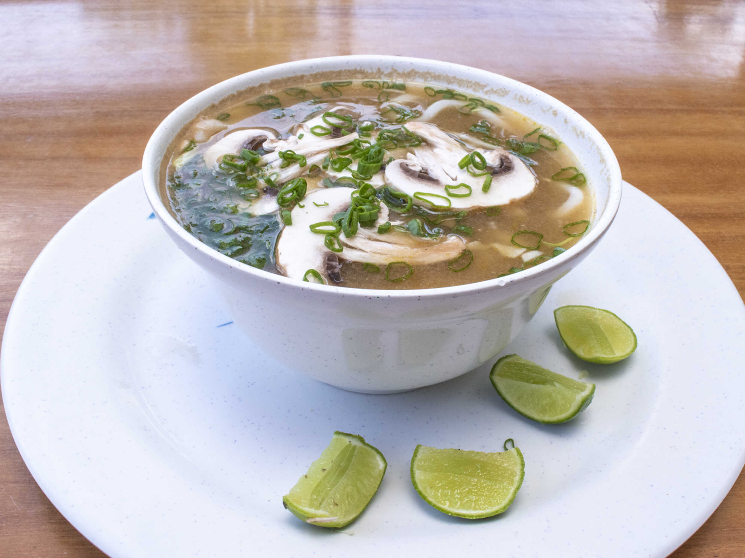 Pollo res champiñones col pasta udon y cebollin