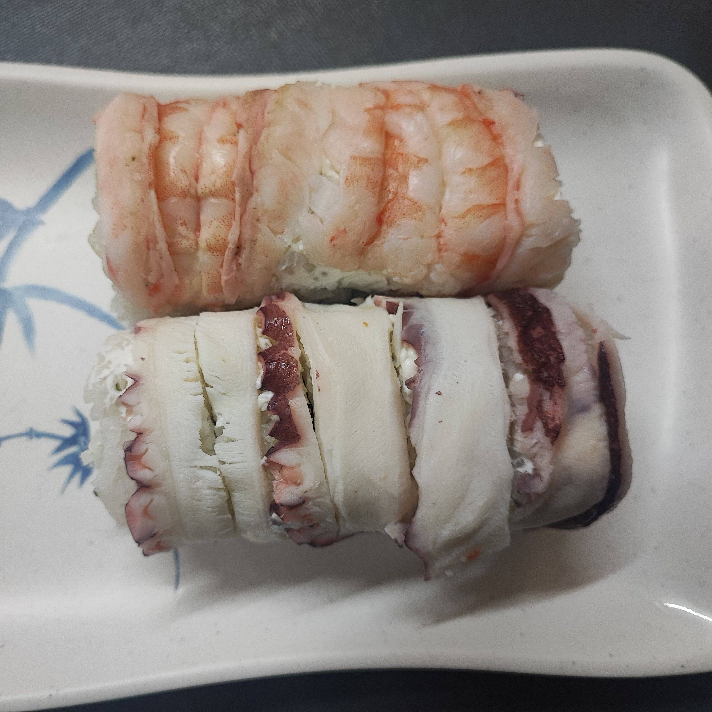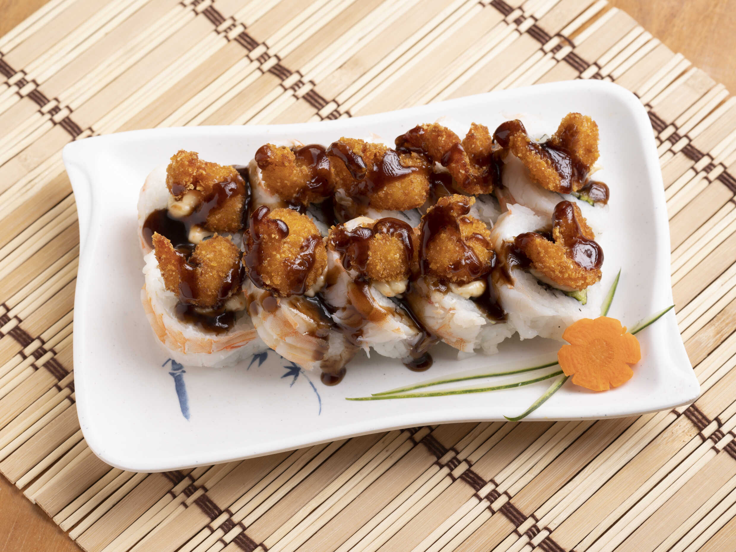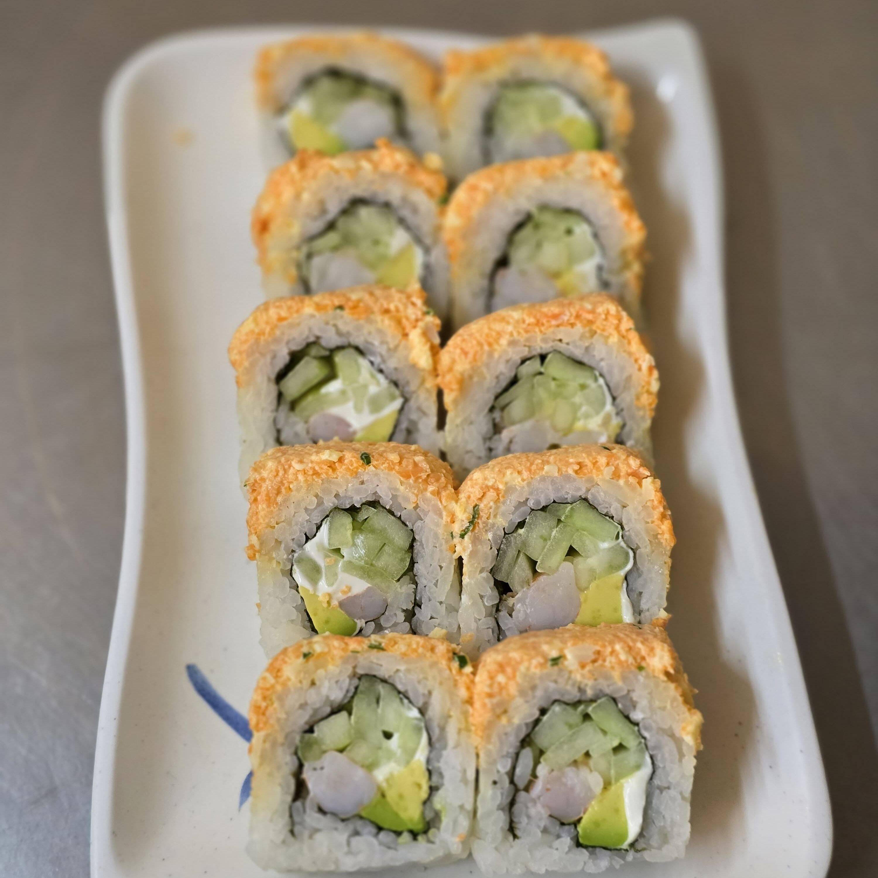 Philadelphia y camaron por fuera con aderezo de masago y camarones empanizados encima y salsa de aguila
