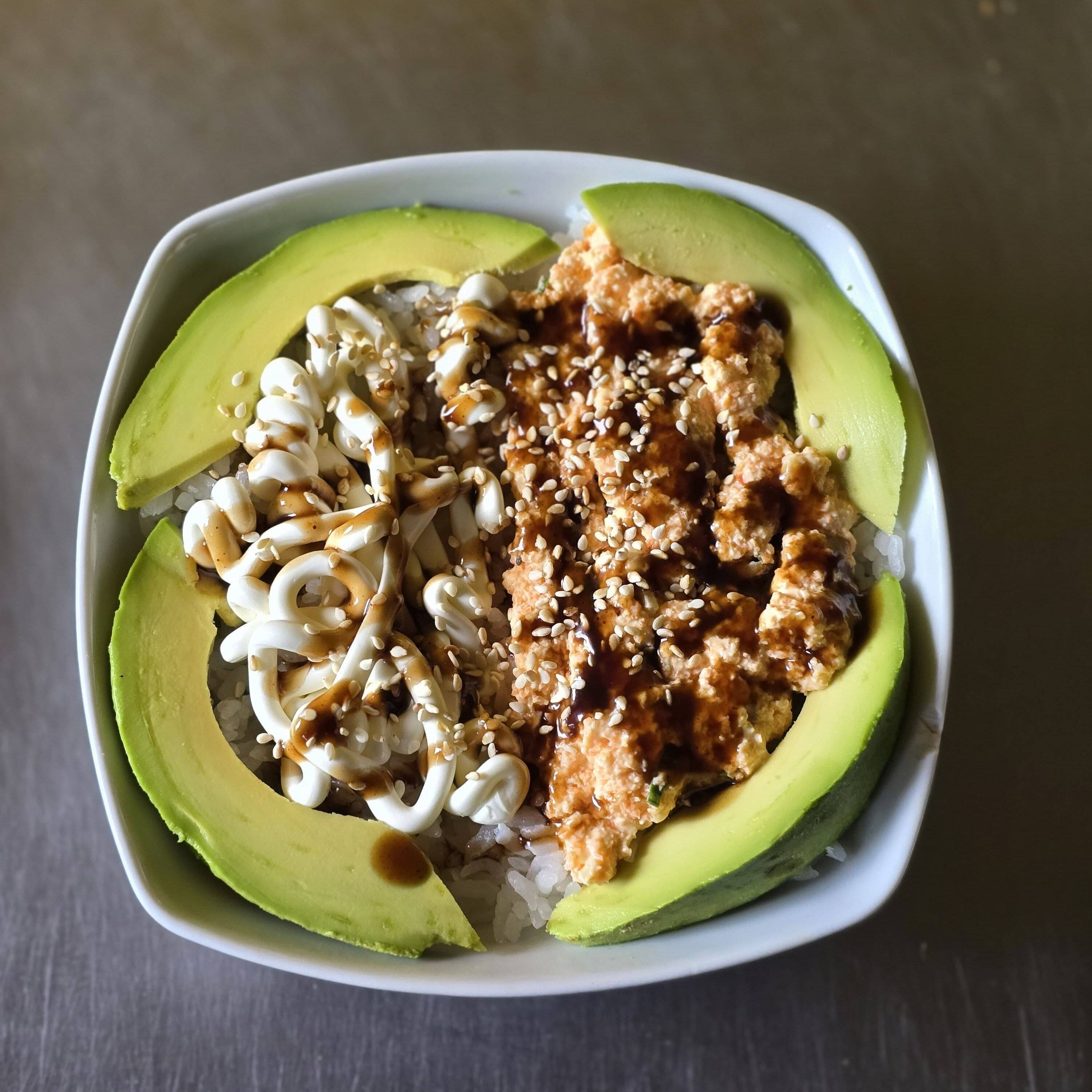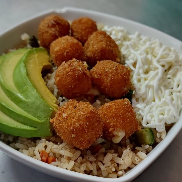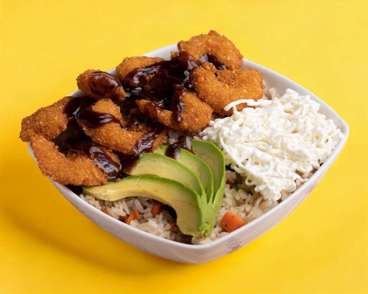 Arroz frito con aguacate philadelphia pollo empanizado y aderezo chipotle