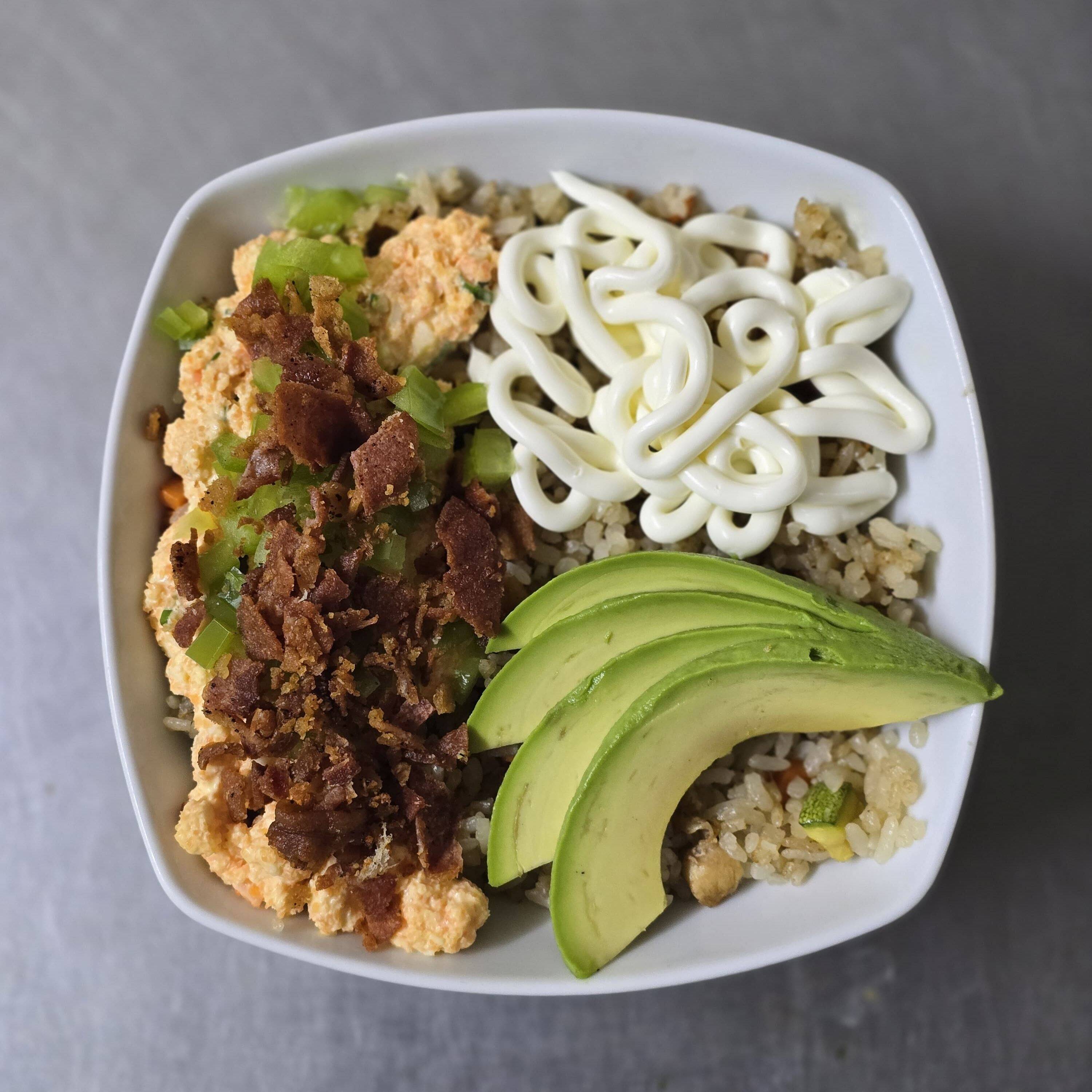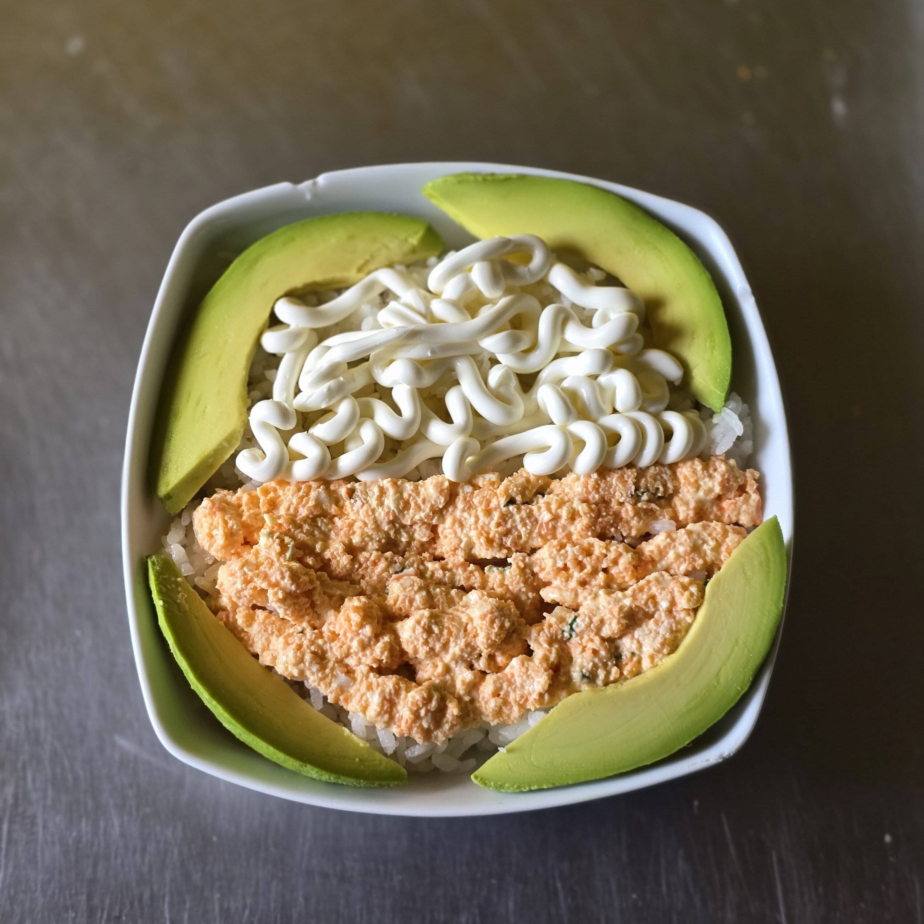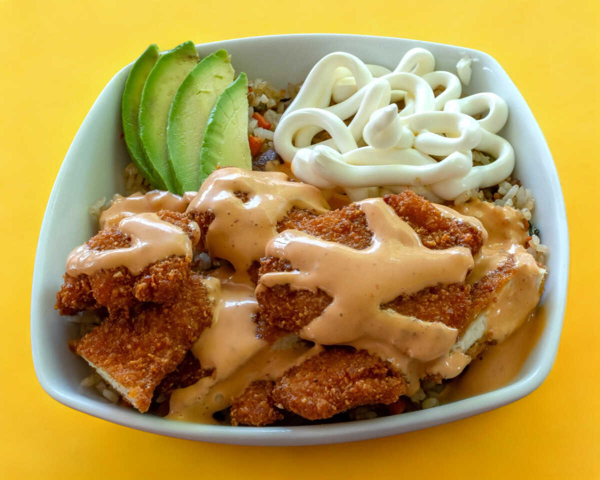 Arroz frito con aguacate philadelphia pollo empanizado y aderezo chipotle