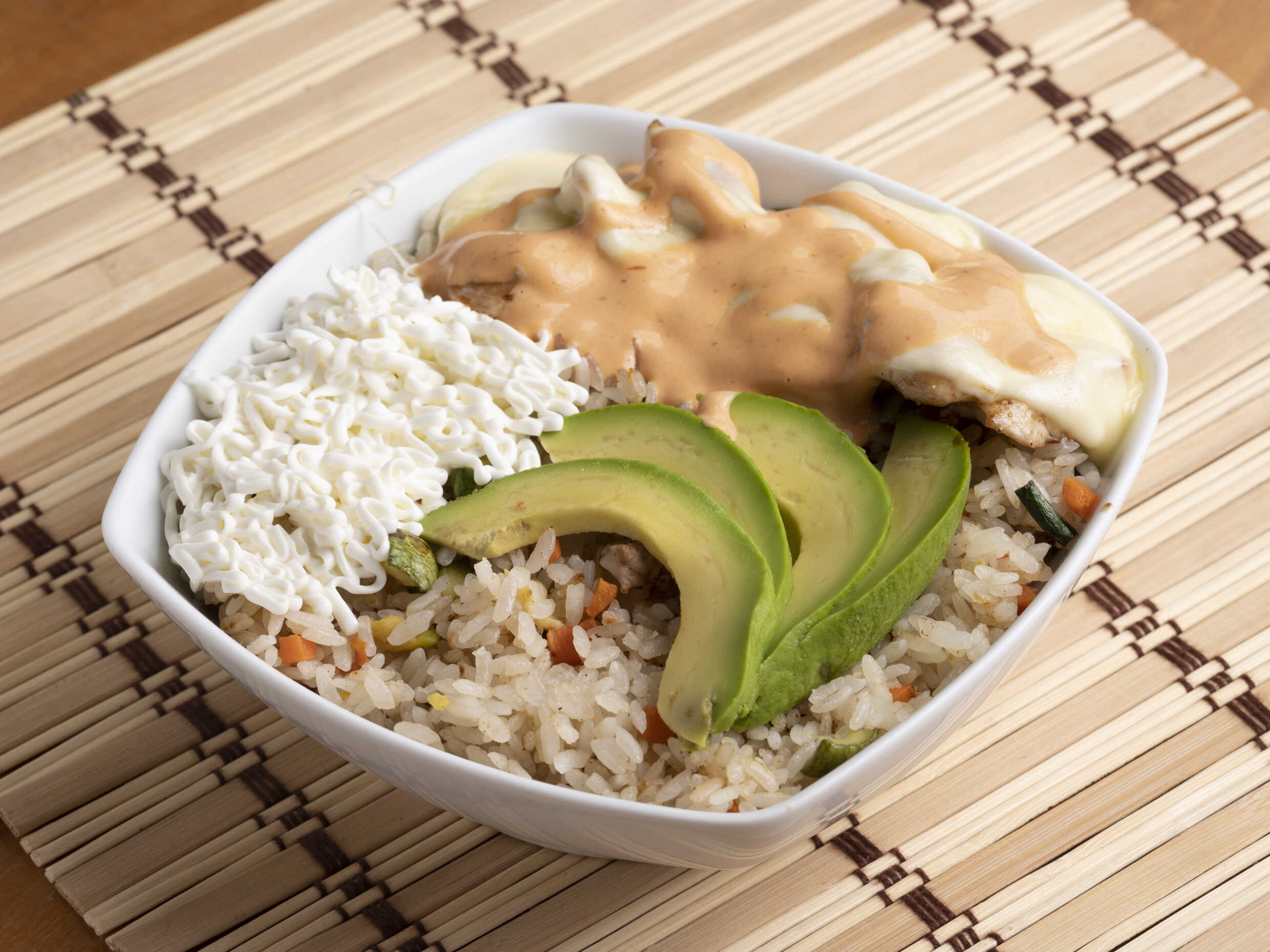 Arroz frito con aguacate queso philadelphia con pollo a la plancha y gratinado con queso manchego y aderezo chipotle