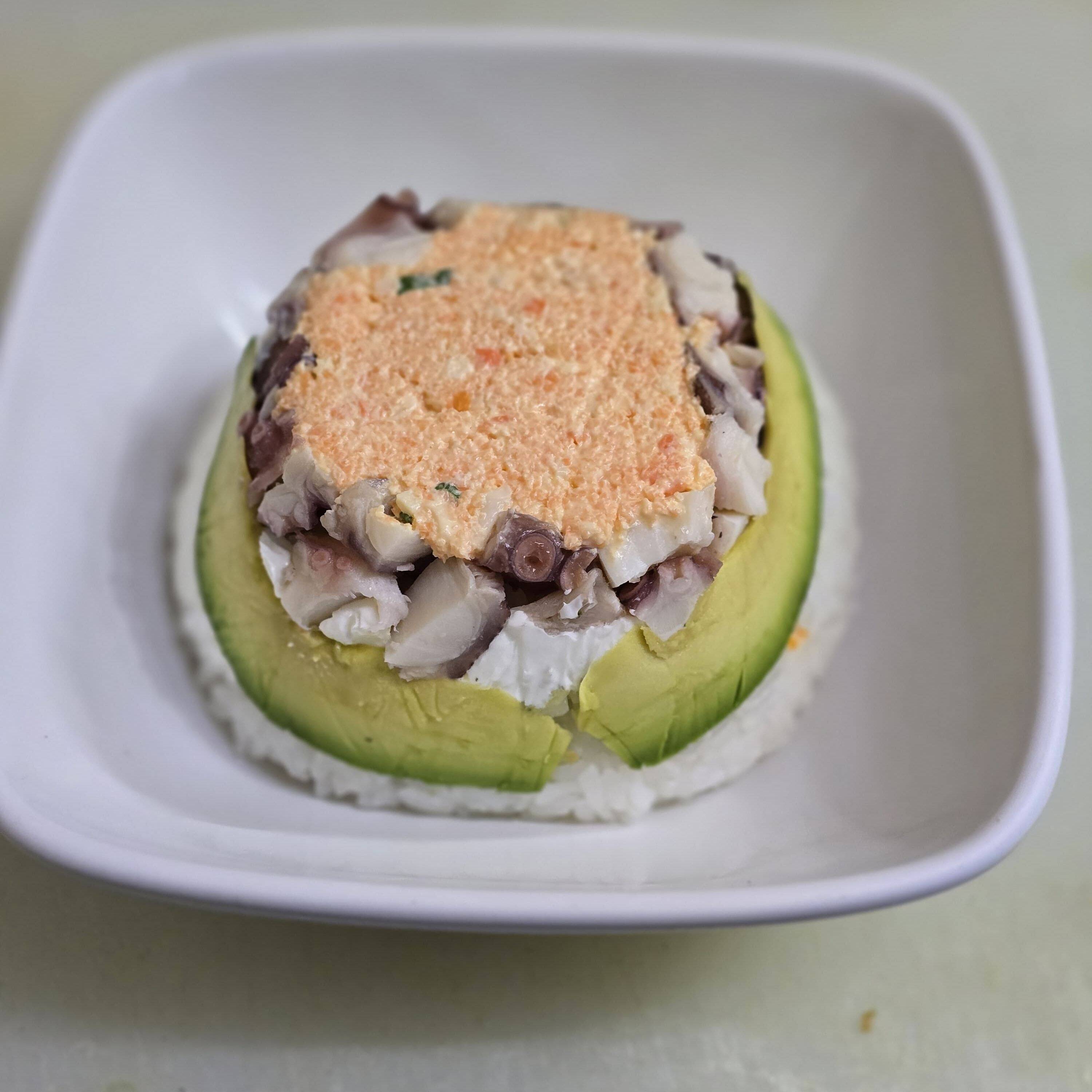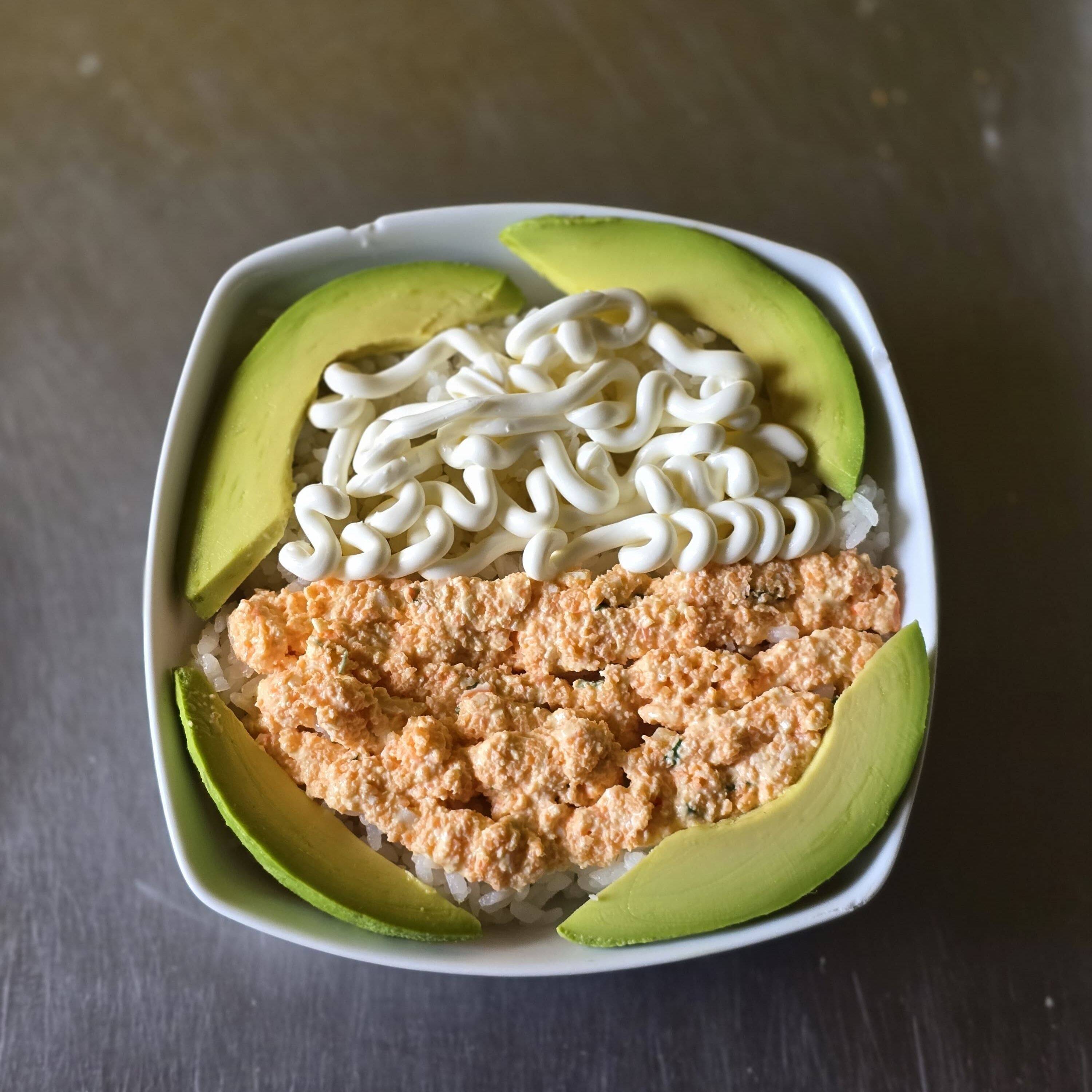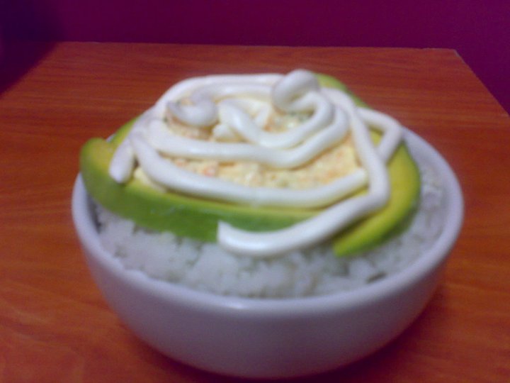 Rica montaña de arroz blanco con tampico aguacate philadelphia y masago con salsa de aguila