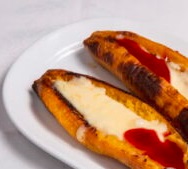 Platano macho capeado, relleno de philadelphia bañado en chocolate o mermelada
