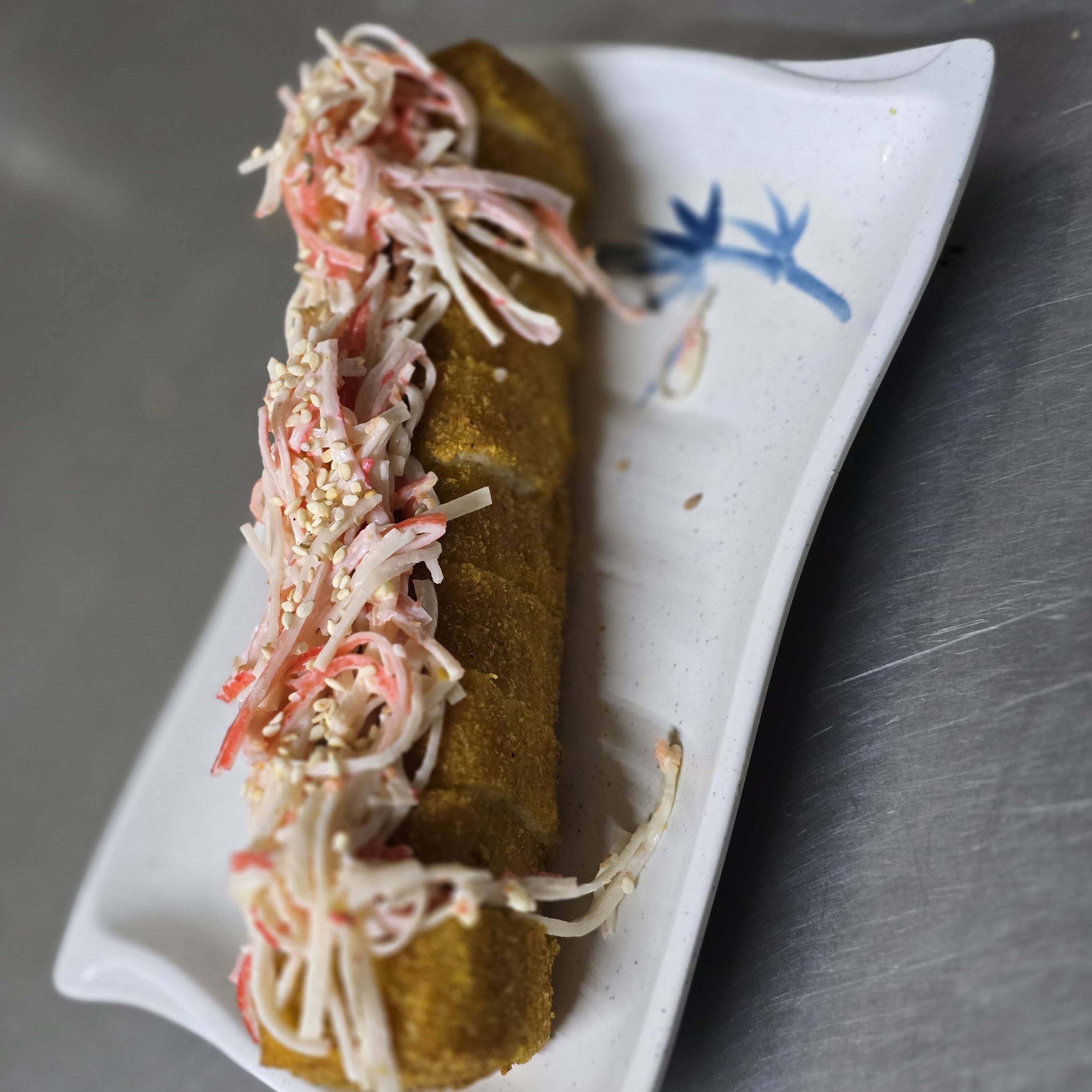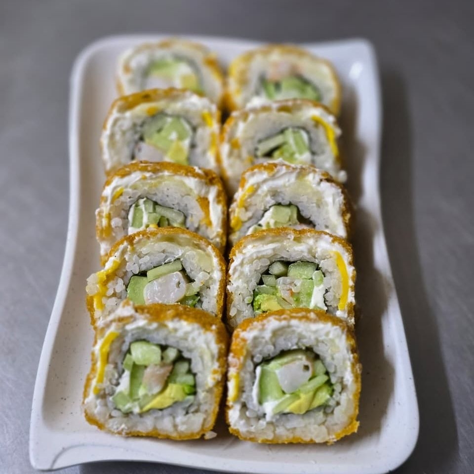 Empanizado por fuera con kanikama,cebollin,ajonjolí y salsa de aguila
