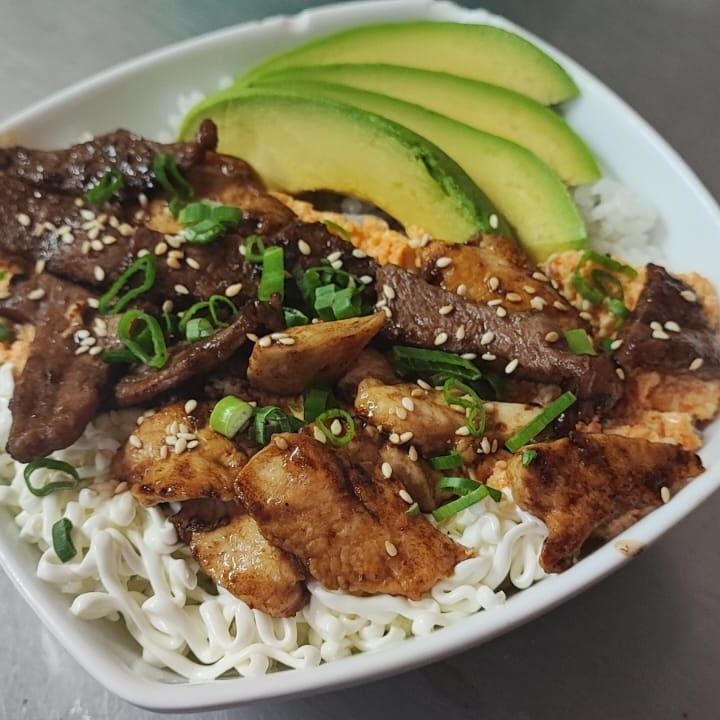 Verduras a la plancha y con carne a elegir (pollo,res,camaron) y pasta udon acompañado de arroz blanco
