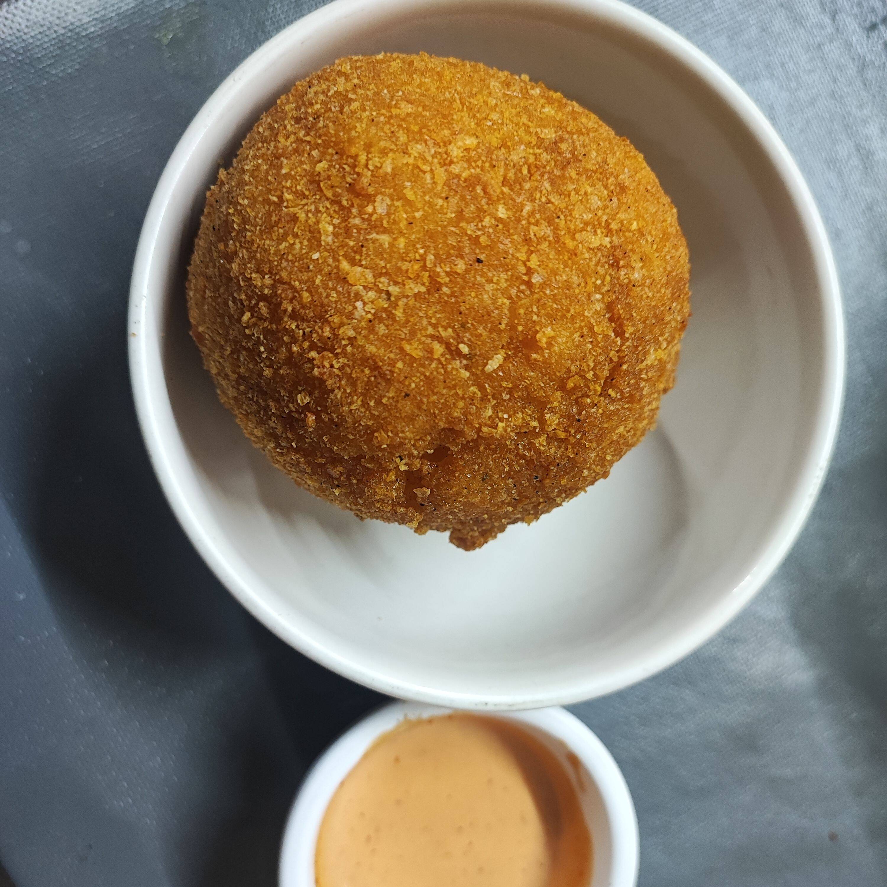 Bola de arroz empanizada,relleno de camaron y philadelphia, se acompaña con aderezo de chipotle