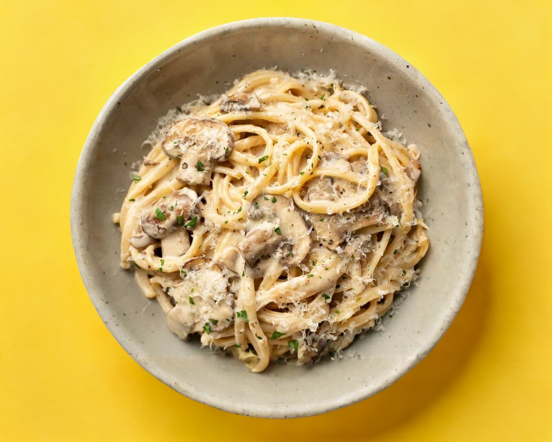 200 gramos de fettuccine con salsa alfredo con champiñones portobello picados y queso parmesano