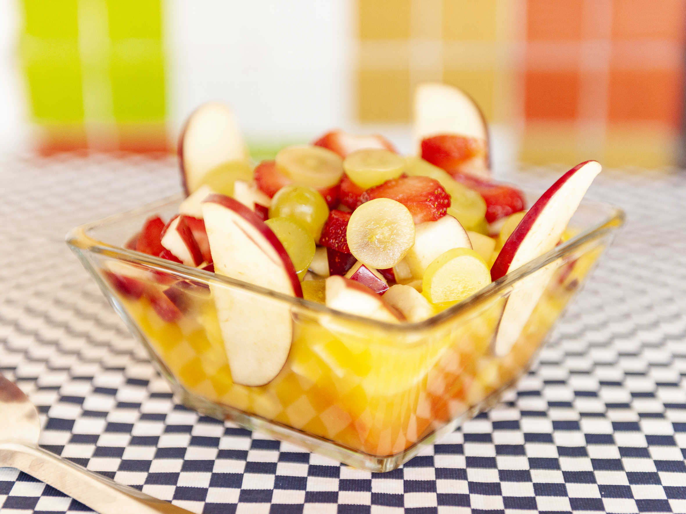 Fresca combinación de frutas tropicales de temporada con jugo de naranja, limón, sal y un toque especial. Piña, mango (solo en temporada), plátano, manzana, fresa, melón, papaya y uva.