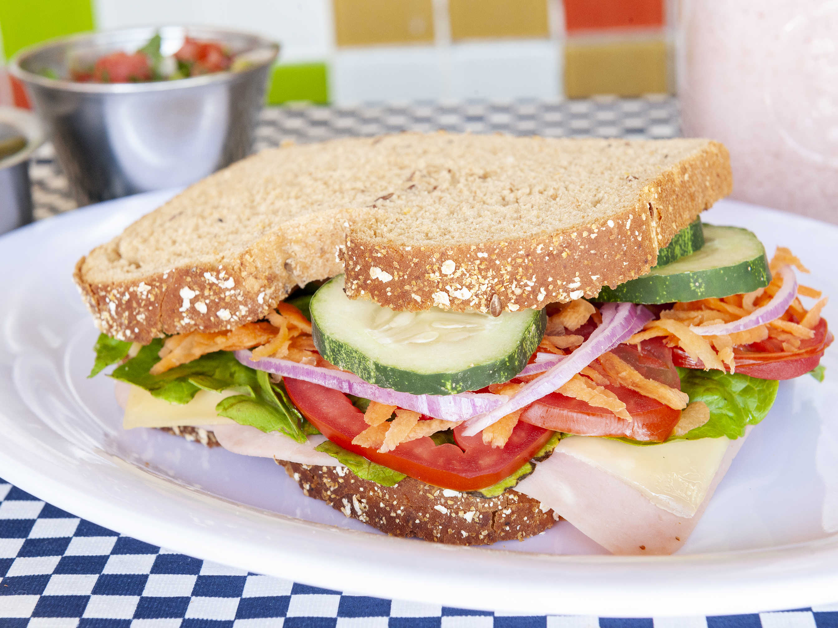 Delicioso y nutritivo sándwich con pan integral de 12 semillas, acompañado de jamón de pavo, lechuga, cebolla, jitomate, pepino y un aderezo especial light.