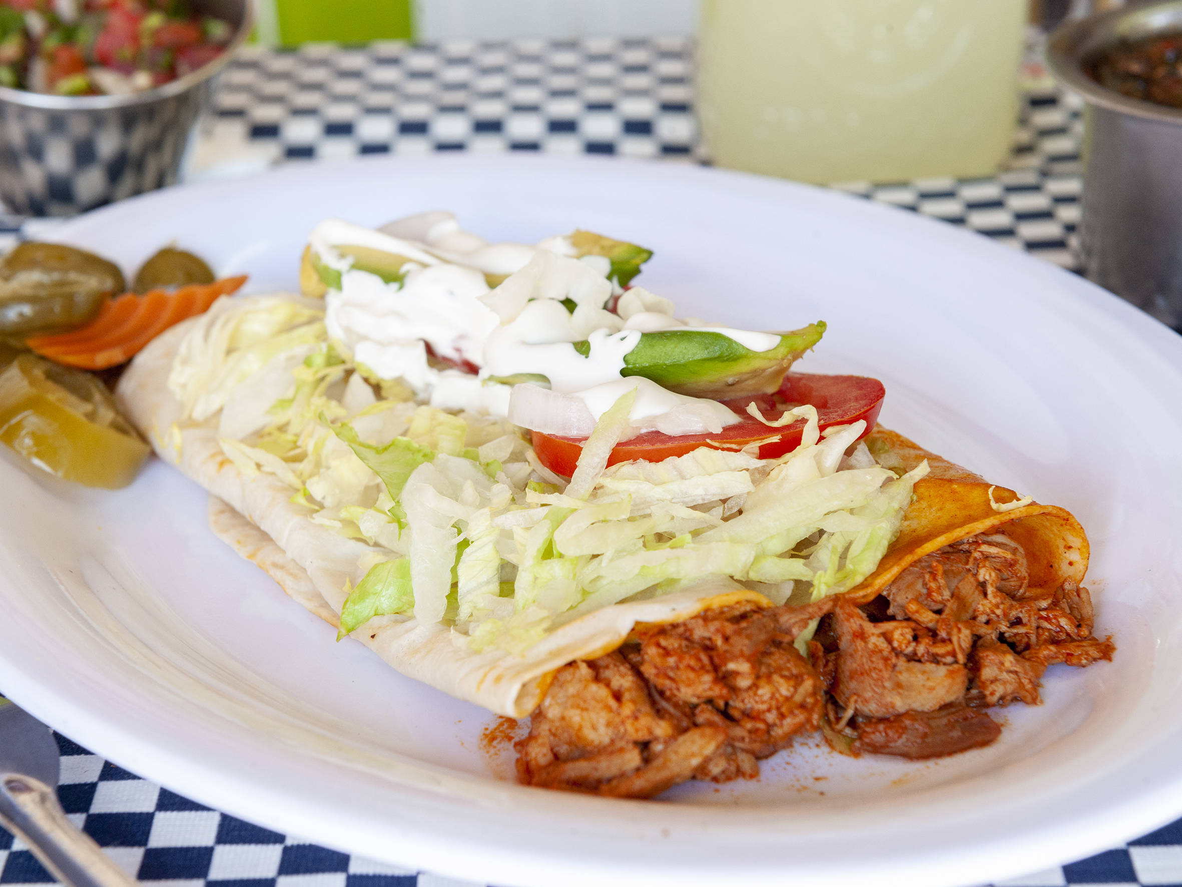 Tortilla de harina enrollada en forma de taco con pierna y frijoles en el interior: complementada con lechuga, jitomate, cebolla, aguacate y crema (orden de 2).