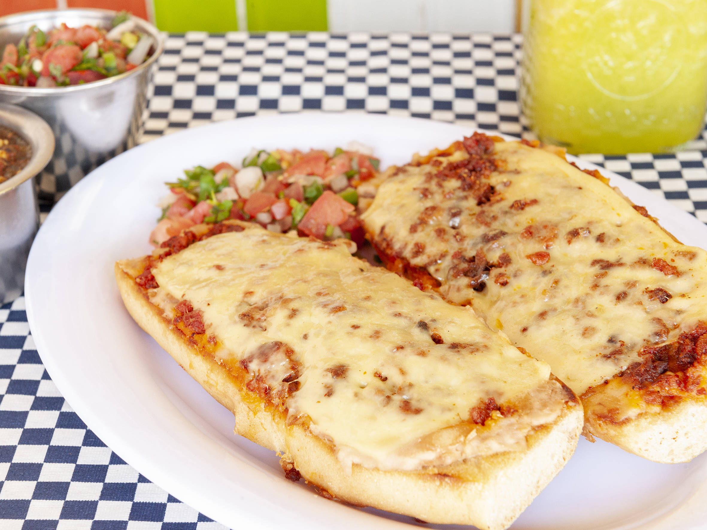 Tortas preparadas con la perfecta combinación de varios ingredientes servidos en pan de telera. Incluye: carne asada, chorizo, morrón, y queso fundido.