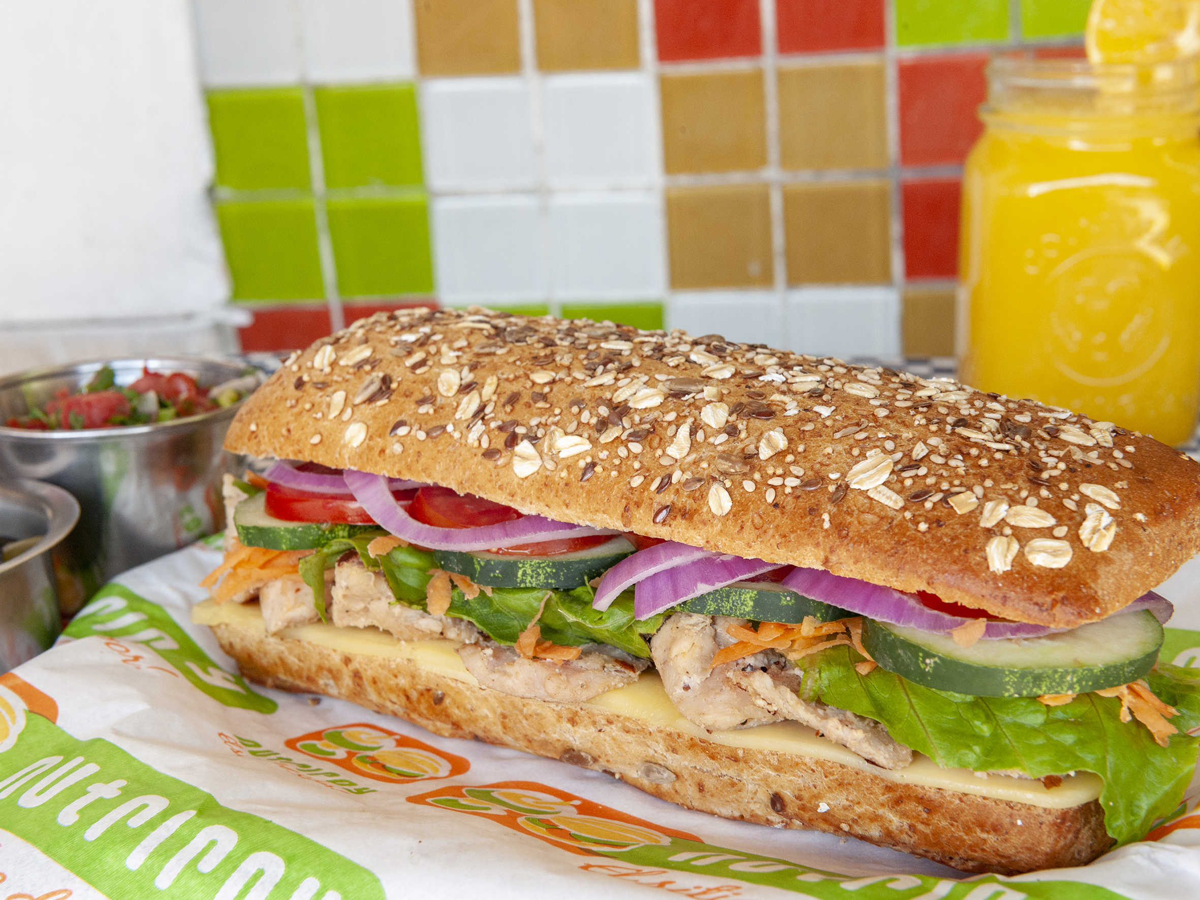 Delicioso y nutritivo sándwich con pan integral de 12 semillas, acompañado de queso gouda, pollo, lechuga, cebolla, jitomate, pepino y un aderezo especial light.