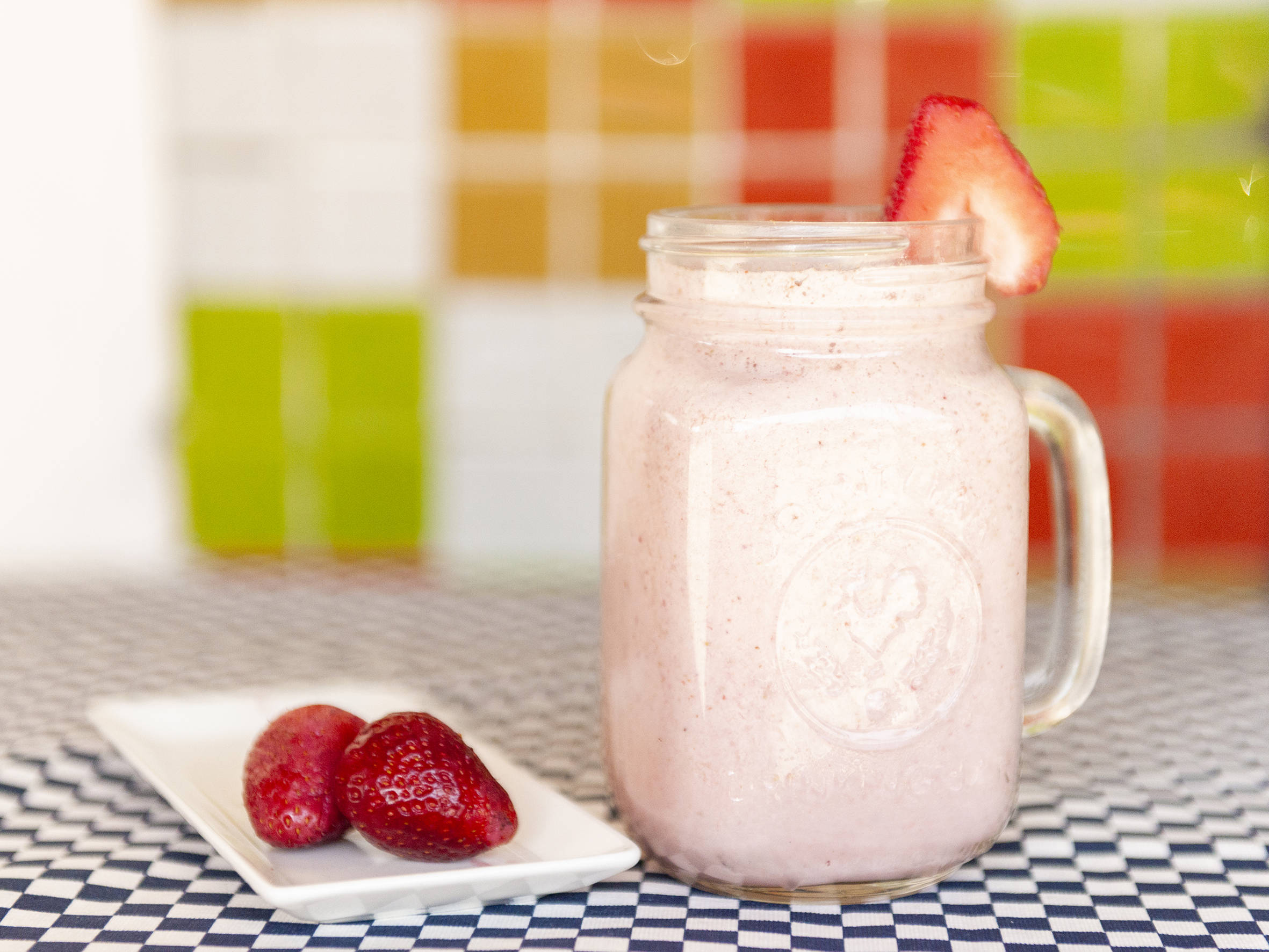 Deliciosa bebida preparada a base de frutas y cereales. Contiene leche, fresa, plátano, nuez y rompope.