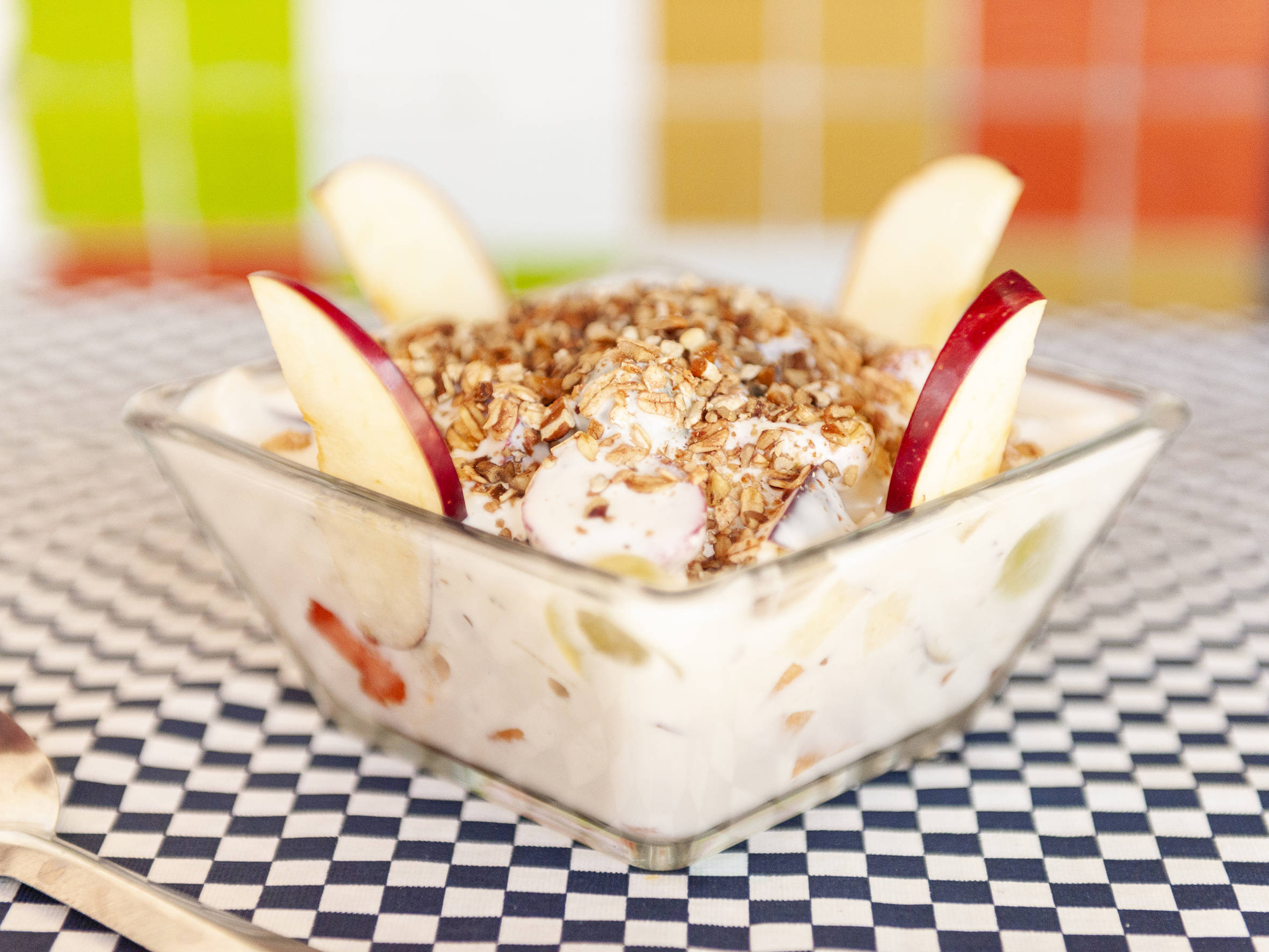 De crema dulce (receta de la casa) o yogurt natural con miel. Fresa, plátano, manzana, papaya, melón, mango (solo en temporada), uva y piña. Elige 3 cereales: granola, arroz inflado, nuez, almendra, amaranto, coco blanco, coco horneado, pasas o granillo de chocolate.