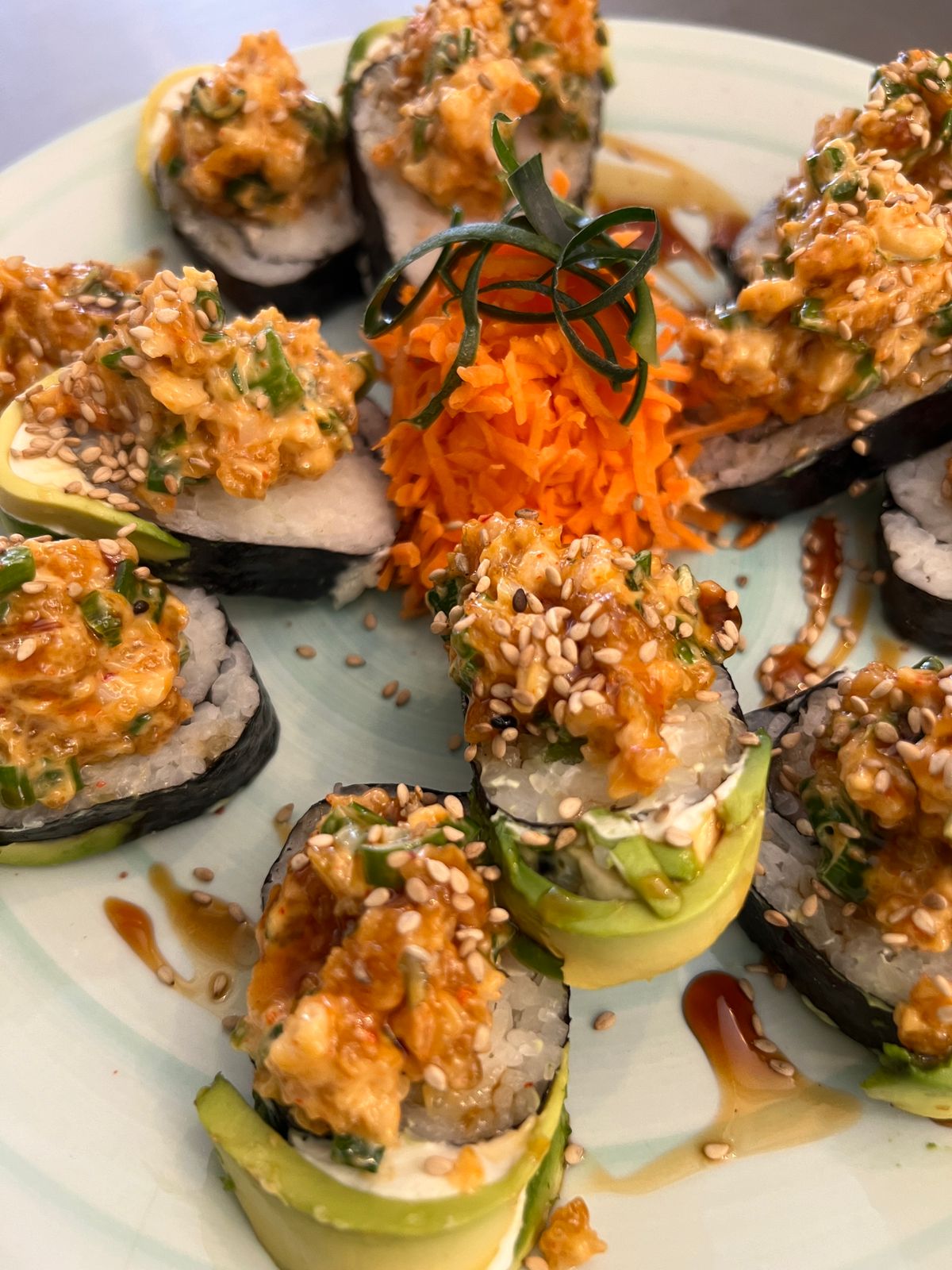 Camarón, philadelphia y pepino por dentro, por fuera aguacate, alga y spicy de camarón empanizado, bañado en salsa de anguila y ajonjolí.