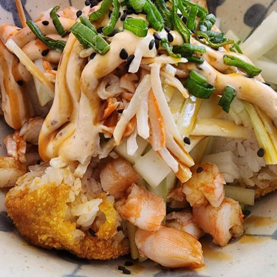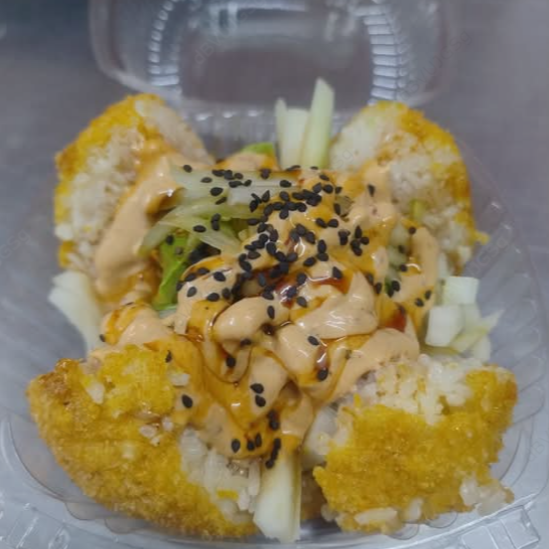 Bola de arroz empanizada, rellena de una deliciosa mezcla de camarón, pulpo, surimi y pepino en un aderezo picante, coronada con aguacate y ajonjolí.