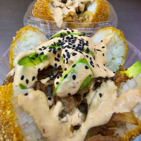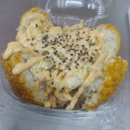 Bola de arroz empanizada, rellena de Philadelphia, aguacate y pepino, coronado con aderezo de chipotle, salsa de anguila y ajonjolí.