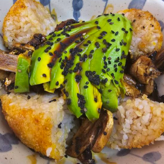 Bola de arroz empanizada, rellena de cebolla y res guisada, coronada con aguacate, aderezo de chipotle ajonjolí.