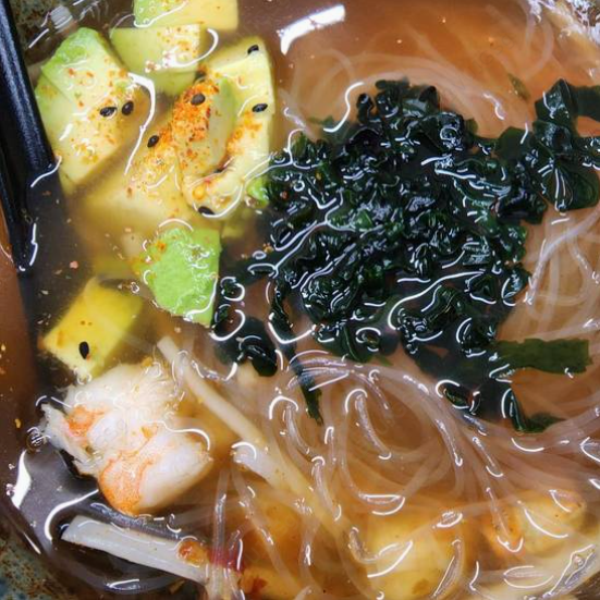 Caldo picoso con pulpo, camarón, surimi, aguacate, wakame y fideo de arroz 1/2 litro.