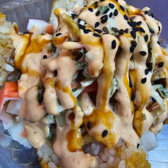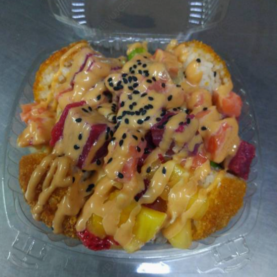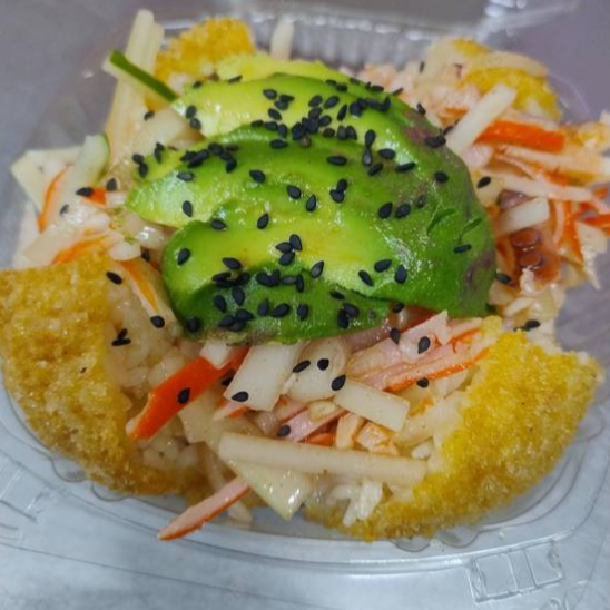 Bola de arroz empanizada, rellena de surimi, Philadelphia, aguacate y pepino. Coronada con ensalada tampico, aderezo de chipotle, salsa de anguila y ajonjolí.
