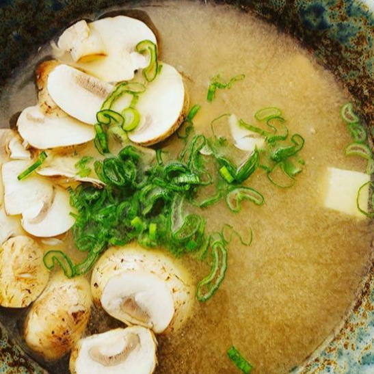 Caldo miso con tofu, champiñones, wakame y fideo de arroz 1/2 litro.