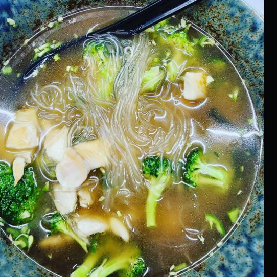 Caldo de pollo con pollo, brócoli, wakame, chile verde, limón y fideo de arroz 1/2 litro.