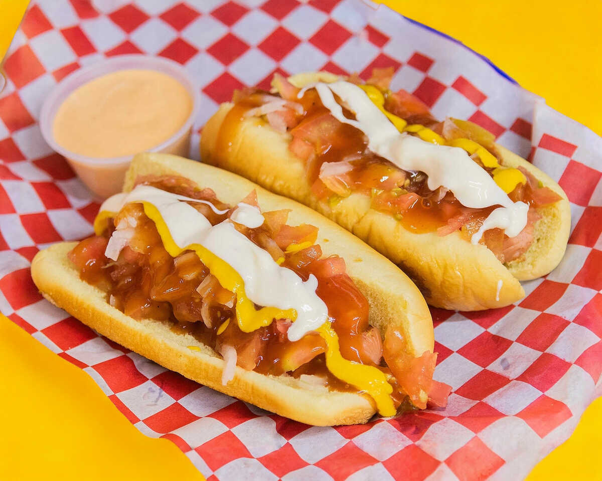 Pan, salchicha de pavo, ketchup, mostaza, tomate y cebolla.