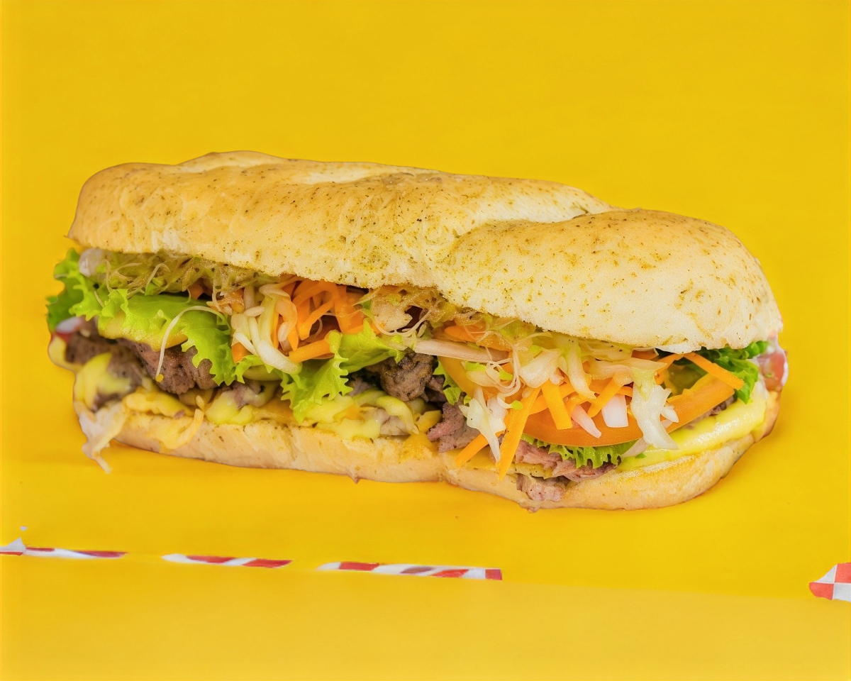 Pan grande con queso amarillo y tocino, acompañado de lechuga, jitomate, cebolla, pepino, zanahoria, ketchup y mostaza.