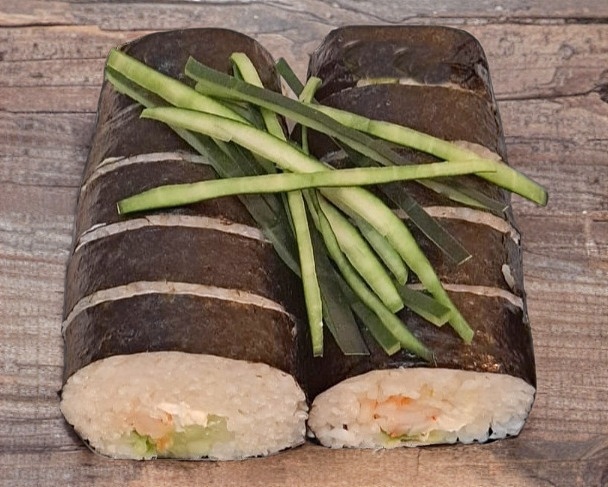 Por dentro: Pepino, Proteína, Aguacate y Philadelphia. Por fuera: Envuelto en alga.