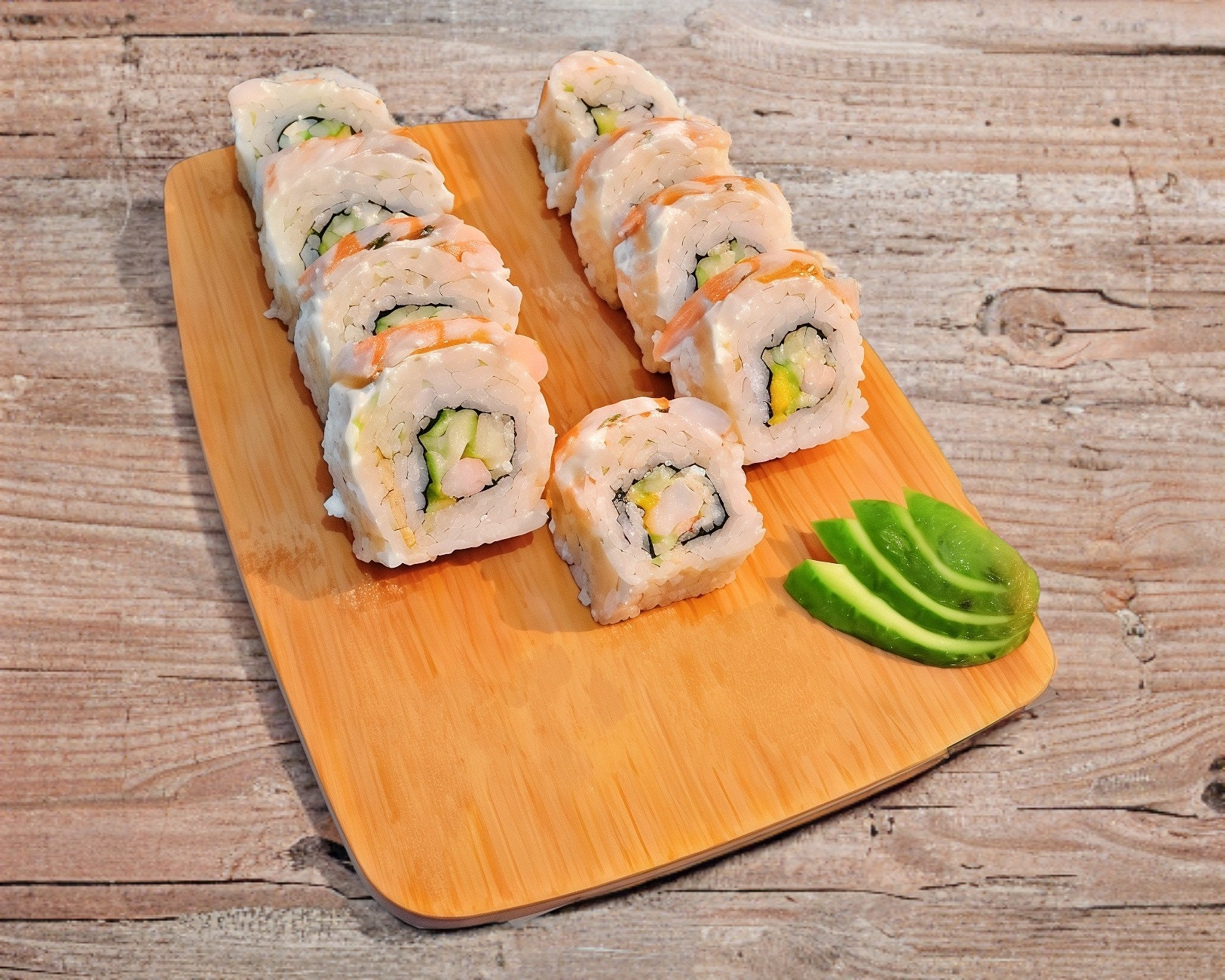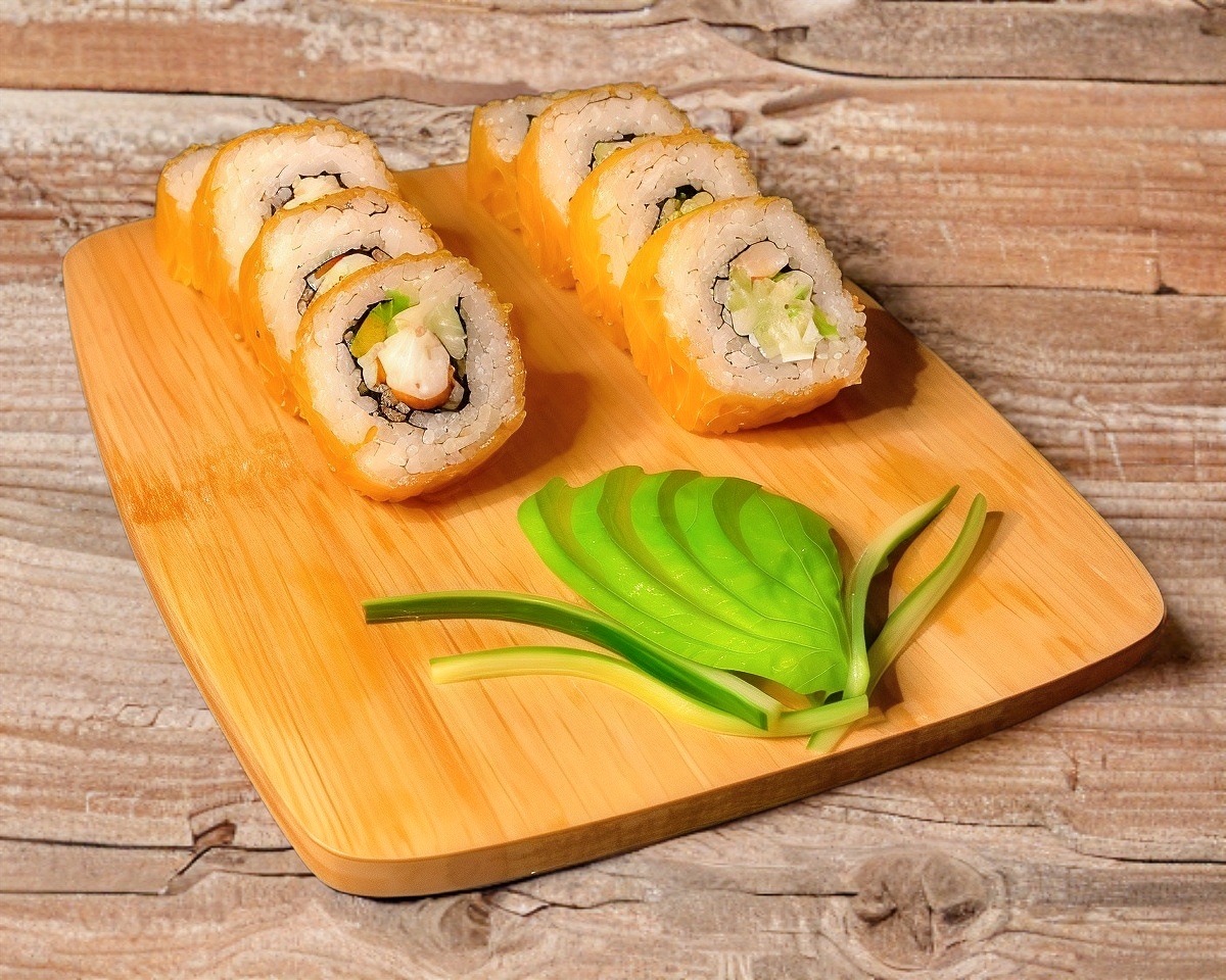 Por dentro: Pepino, Proteína, Aguacate y Philadelphia. Por fuera: Forrado de camarón cocido.