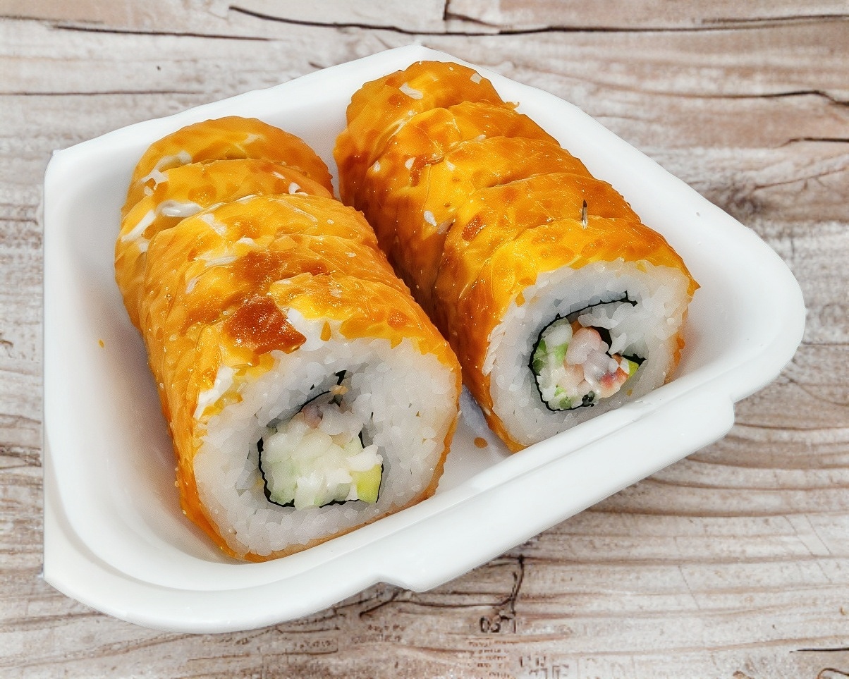 Por dentro: Pepino, Proteína, Aguacate y Philadelphia. Por fuera: empanizado y cubierto con aderezo de kanikama.