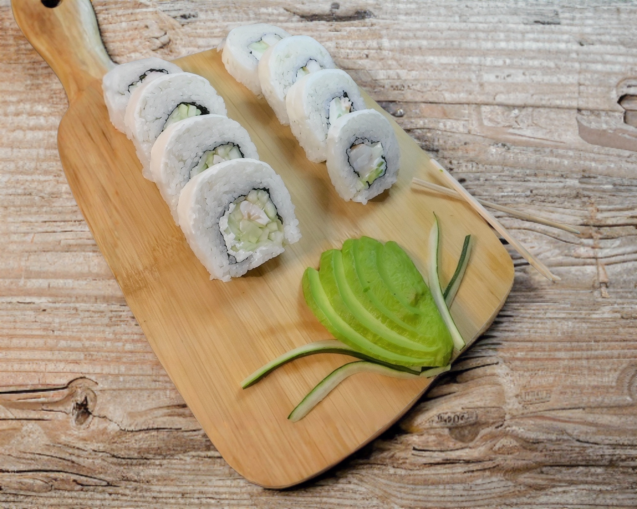 Por dentro: Pepino, Proteína, Aguacate y Philadelphia. Por fuera: Forrado de Aguacate.