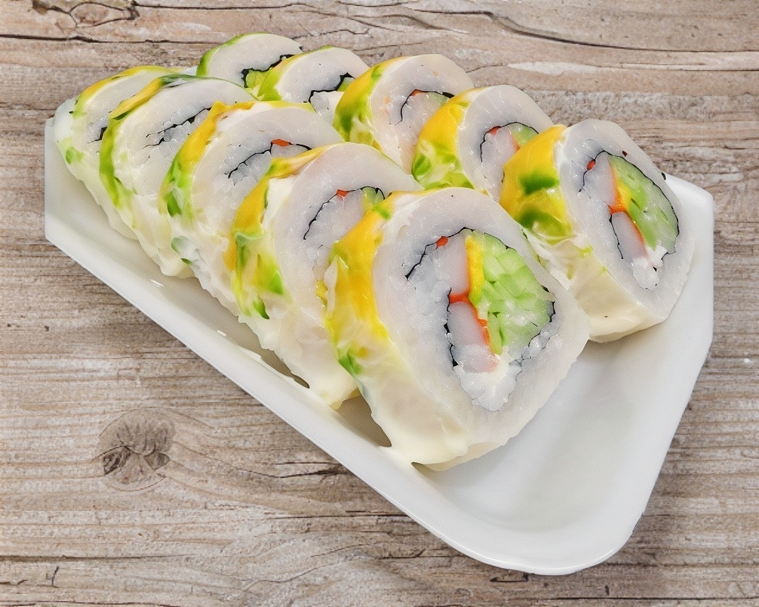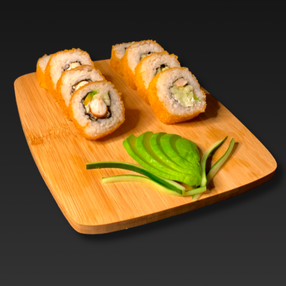 Por dentro: Pepino, Camarón, Res, Aguacate y Philadelphia. Por fuera: empanizado.
