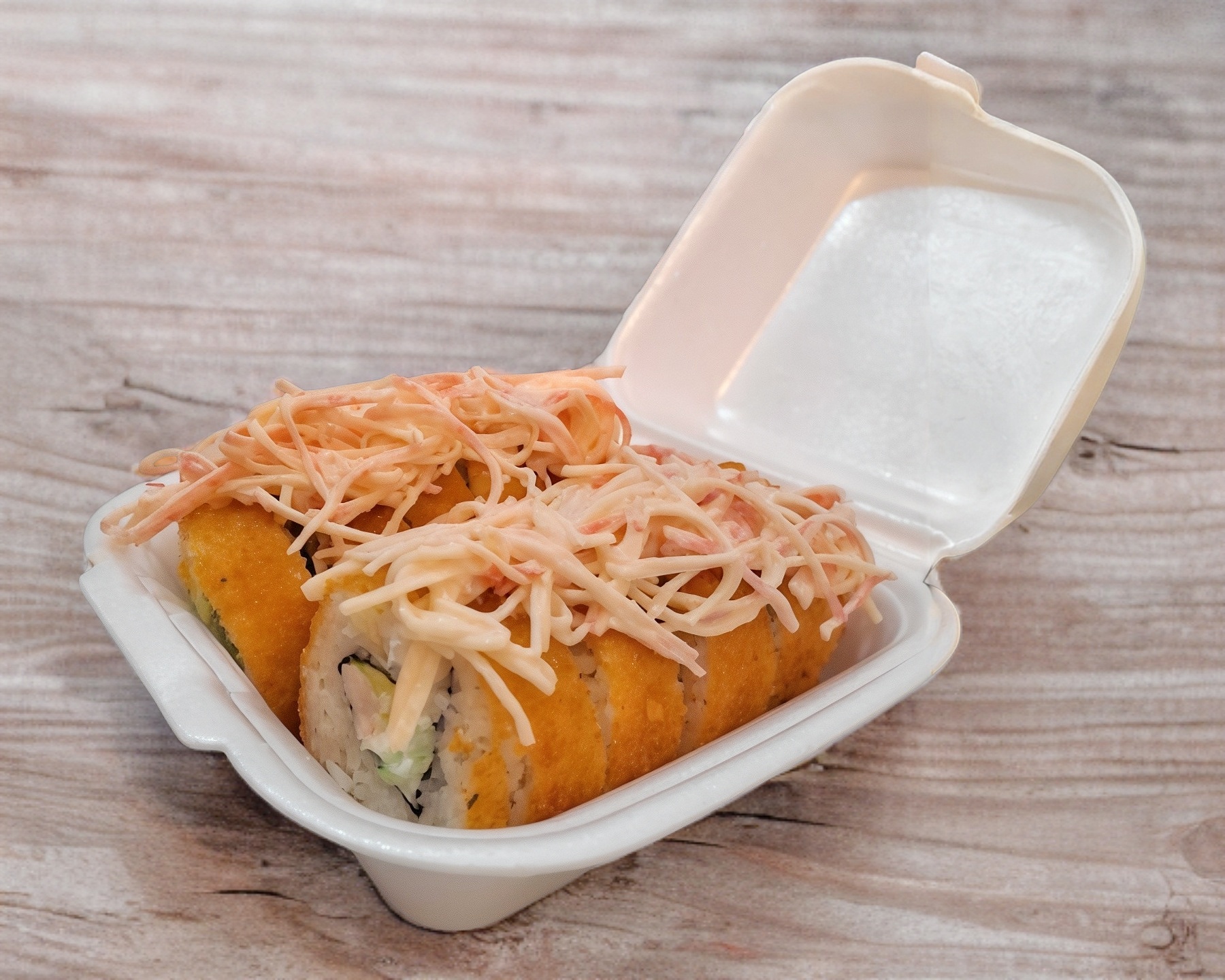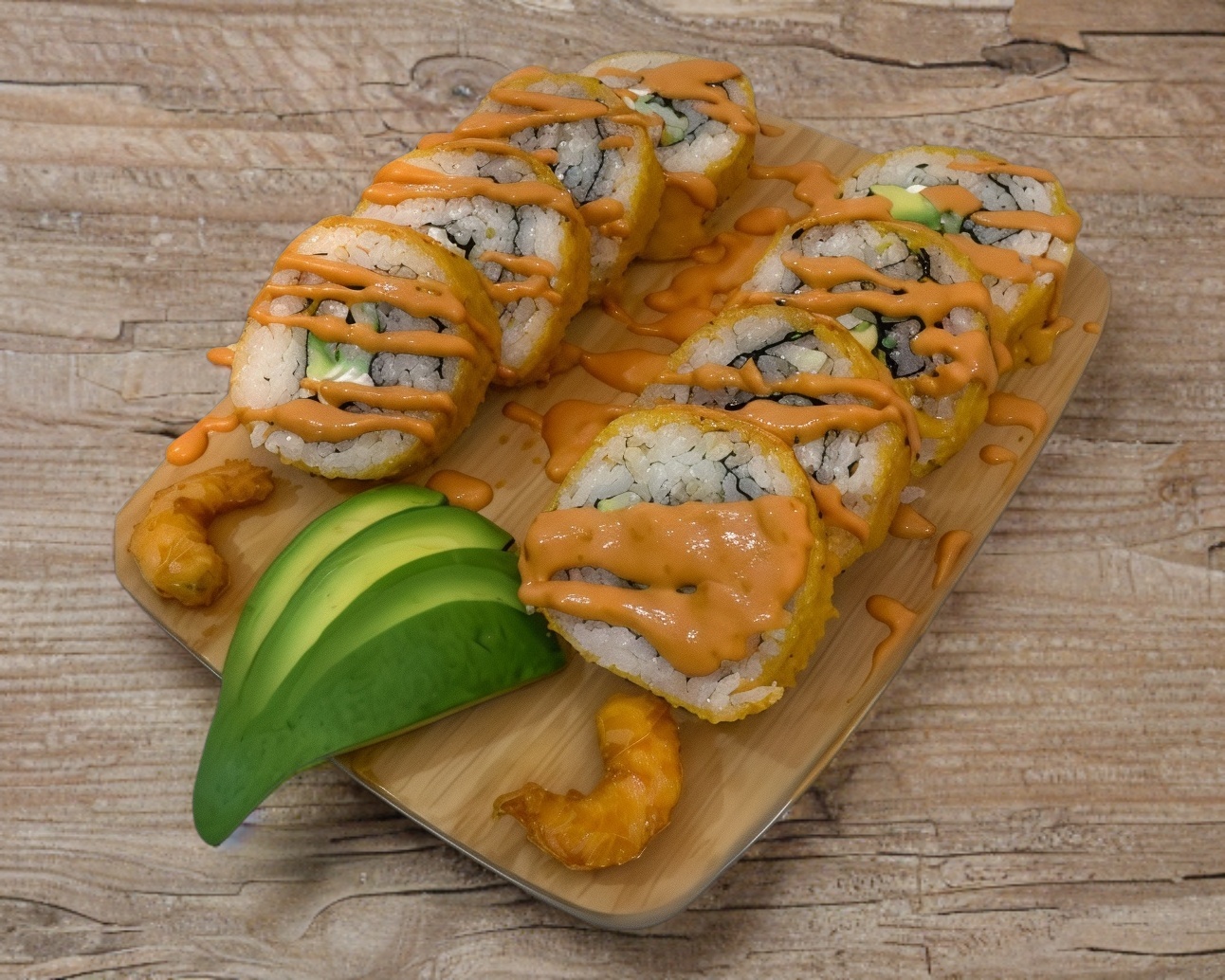 Por dentro: Pepino, Philadelphia y camarón. Por fuera: Empanizado, queso derretido, una flor de aguacate y bañado en siracha