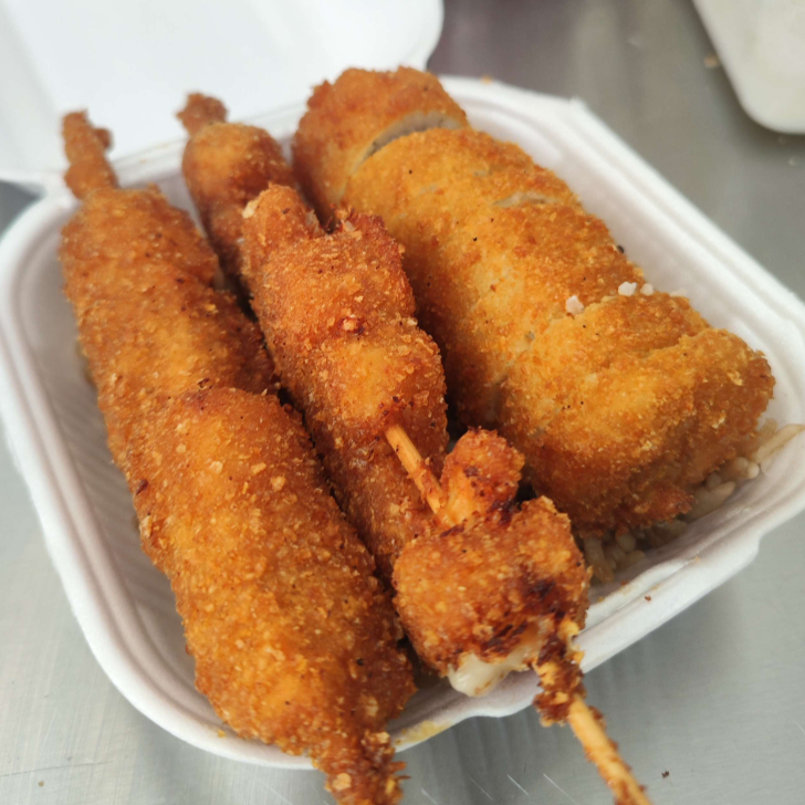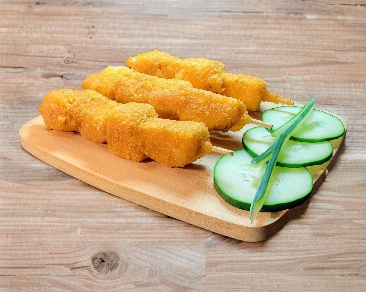 3 brochetas con queso y (plátano o camarón) empanizados.