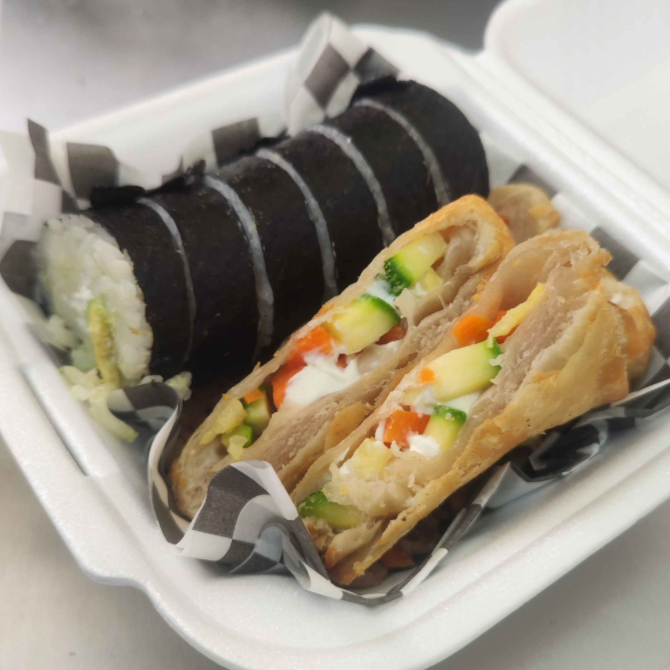 Combo 1; Medio sushi, 2 rollitos Primavera, en una basse de arroz frito y con bebida incluida.